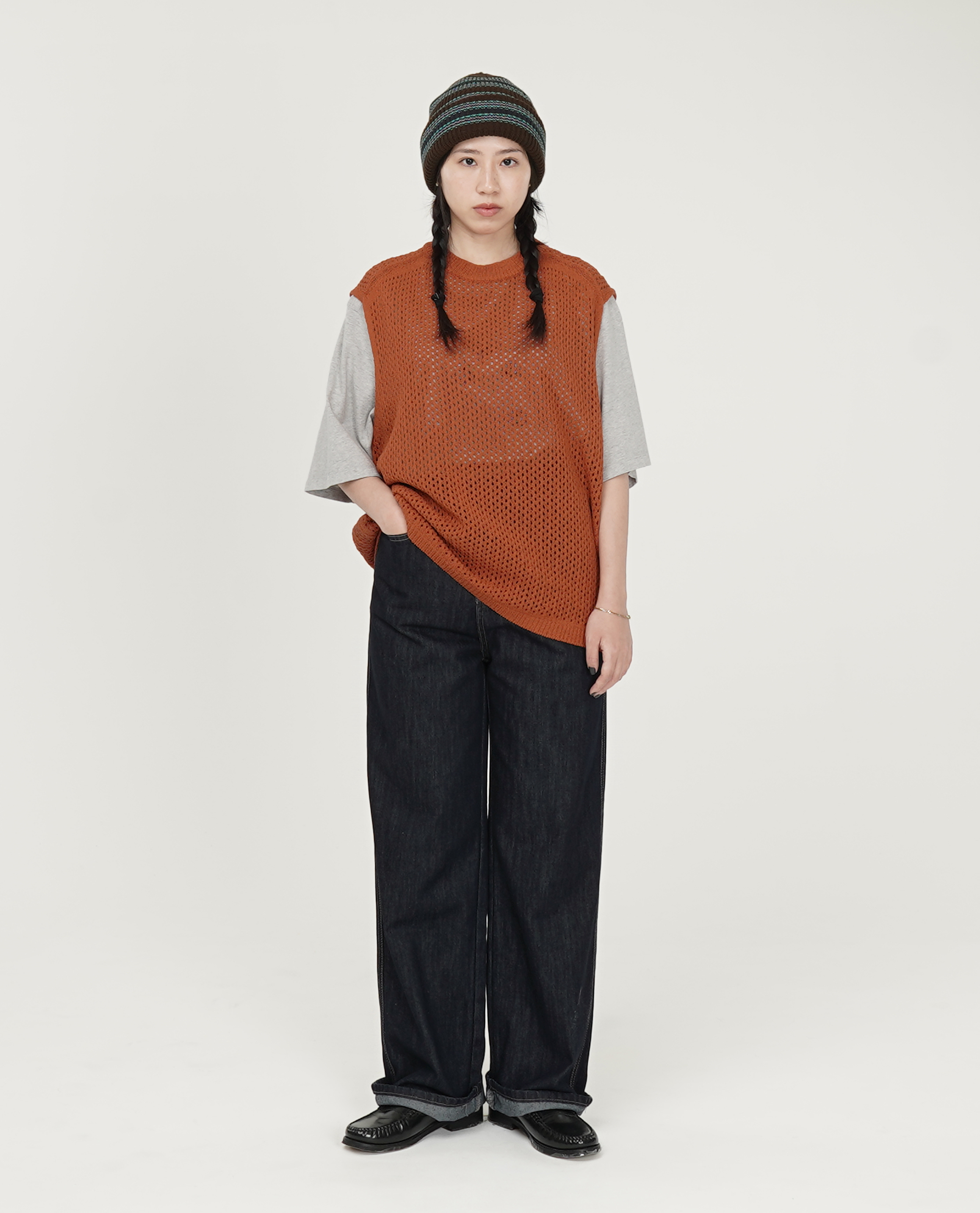 *看 Model 上衣:泡泡棉落肩襯衫、小領洞洞背心、POP TRADING COMPANY Pop Mees Letters Logo T-Shirt - 24SS