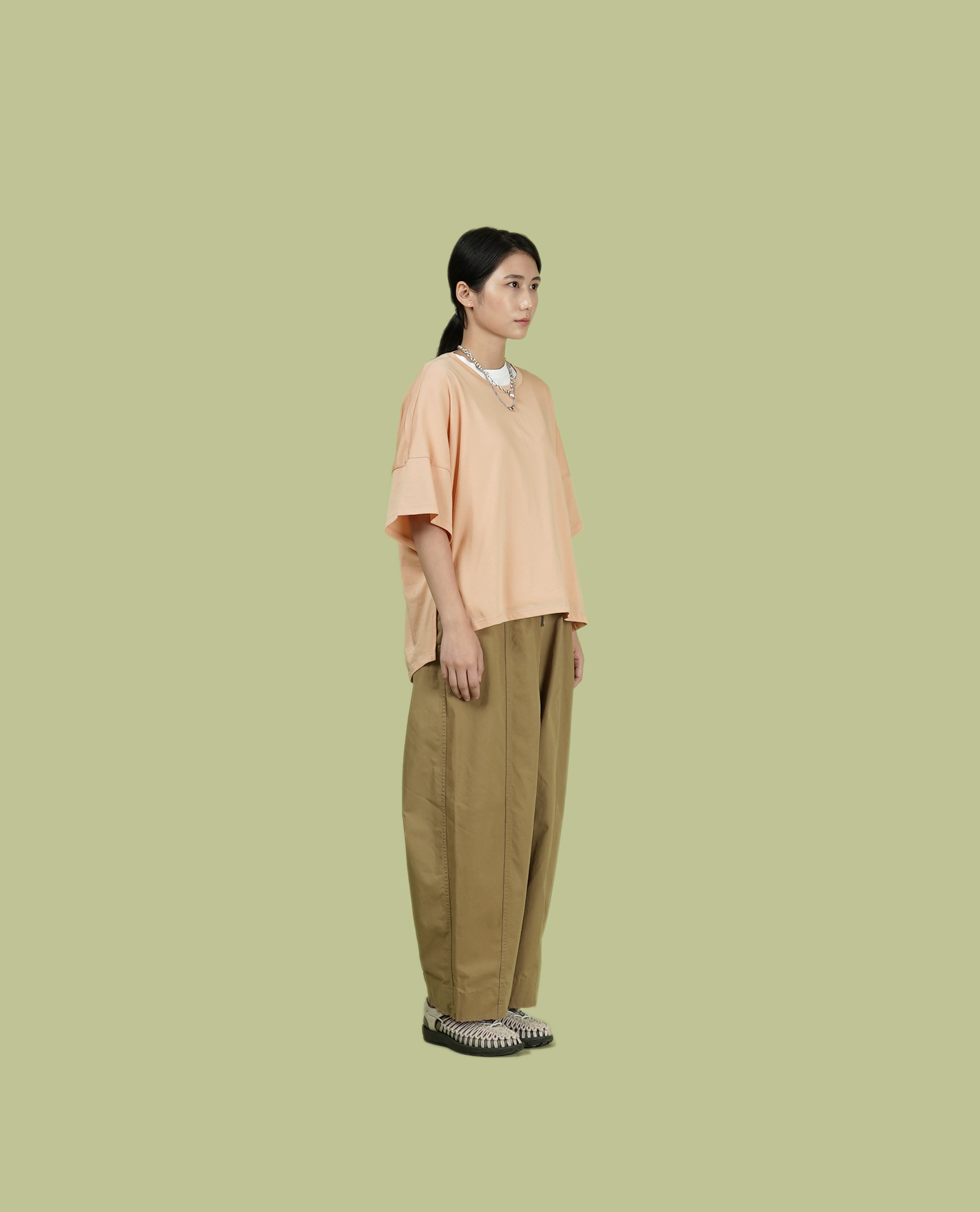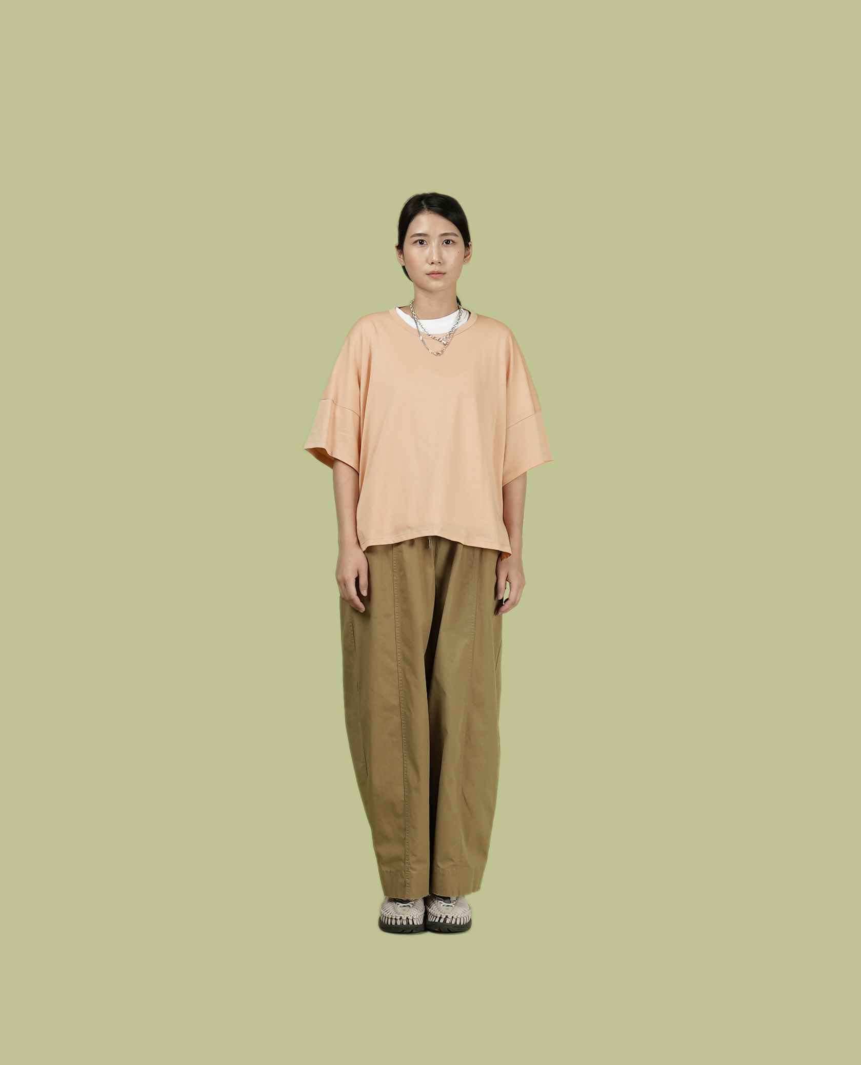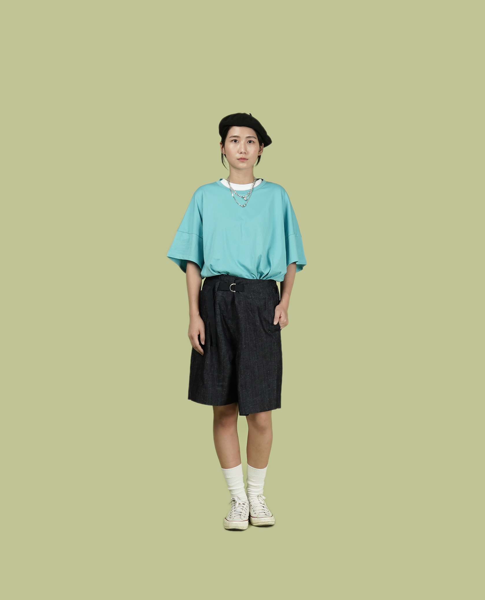*看 Model 褲子:麻料直紋高腰褲、斜綁腰牛仔短褲、前車線下不收邊寬褲