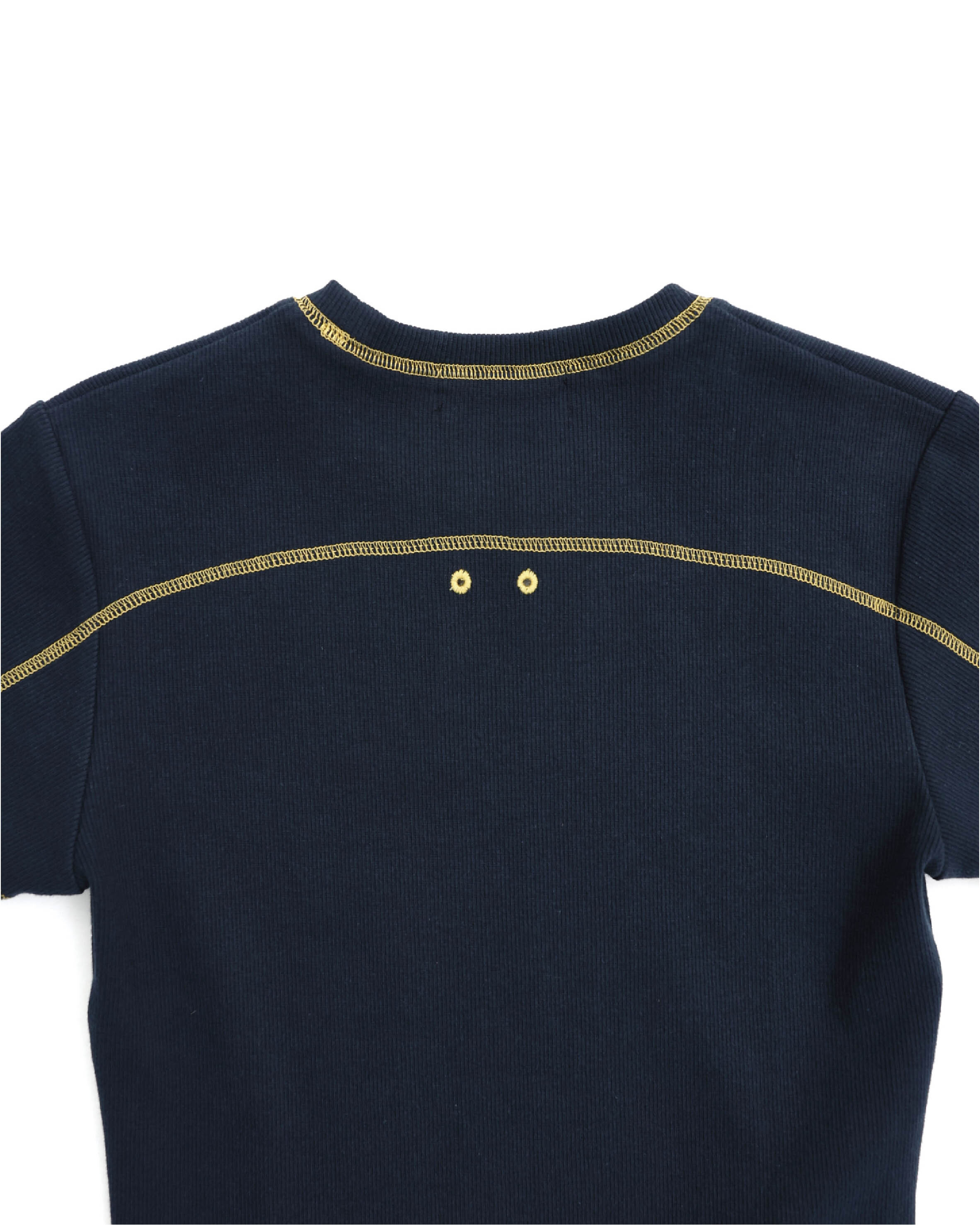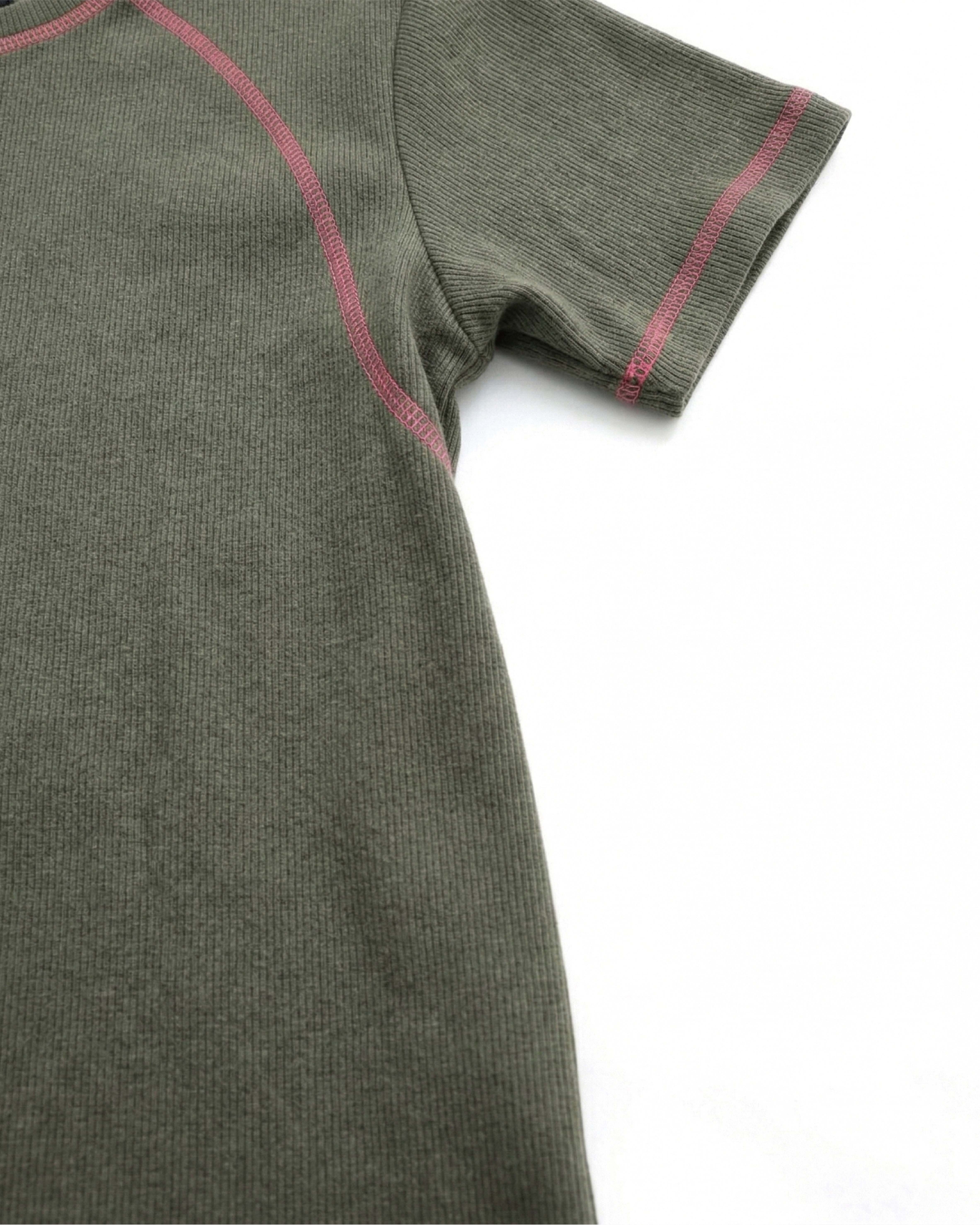 撞色車線點綴的短袖上衣(COLORED STITCH LINE SHORT SLEEVE TEE)。