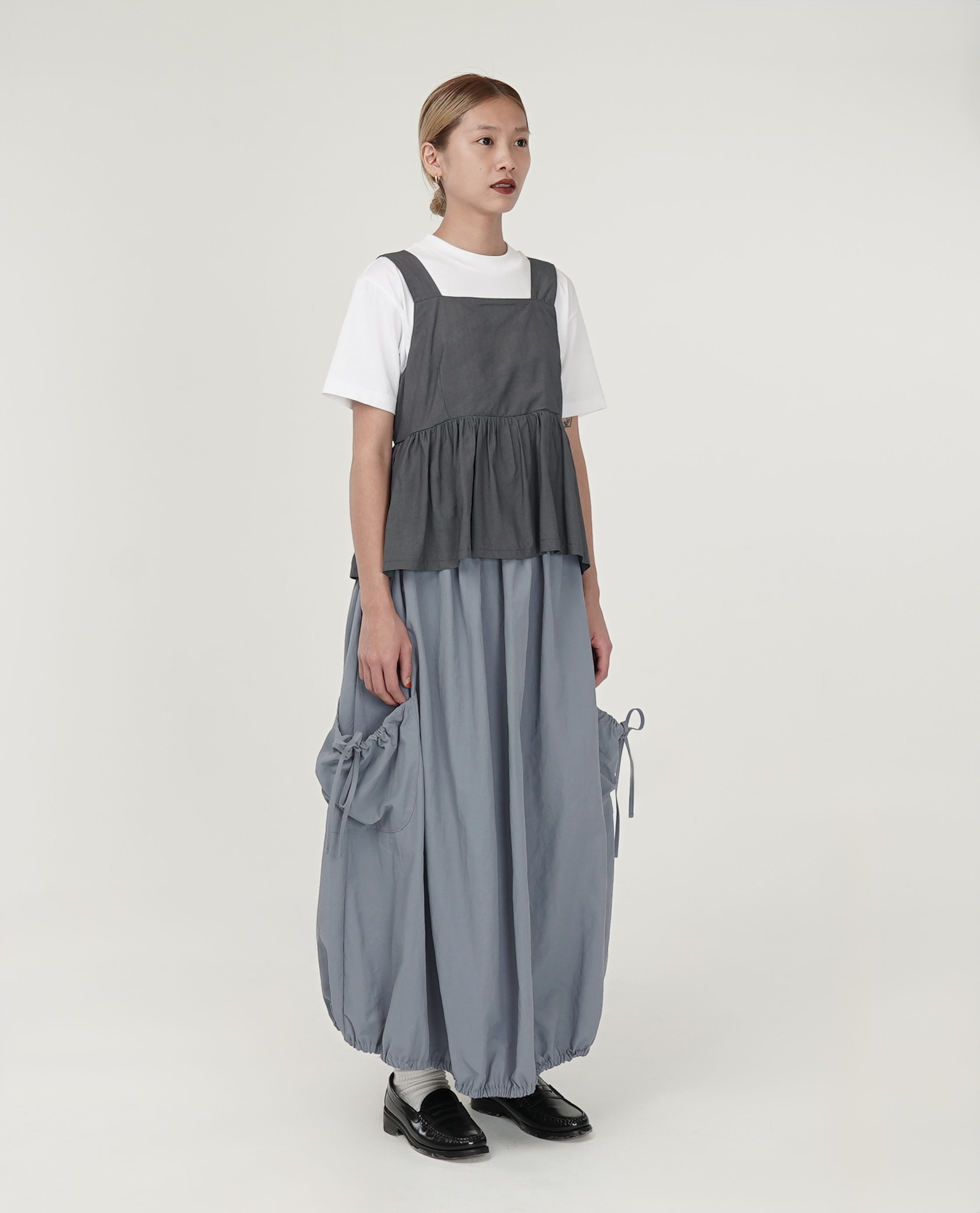 *看 Model 褲子:刷色膝下牛仔褲、鬆緊腰下抽繩澎澎長裙