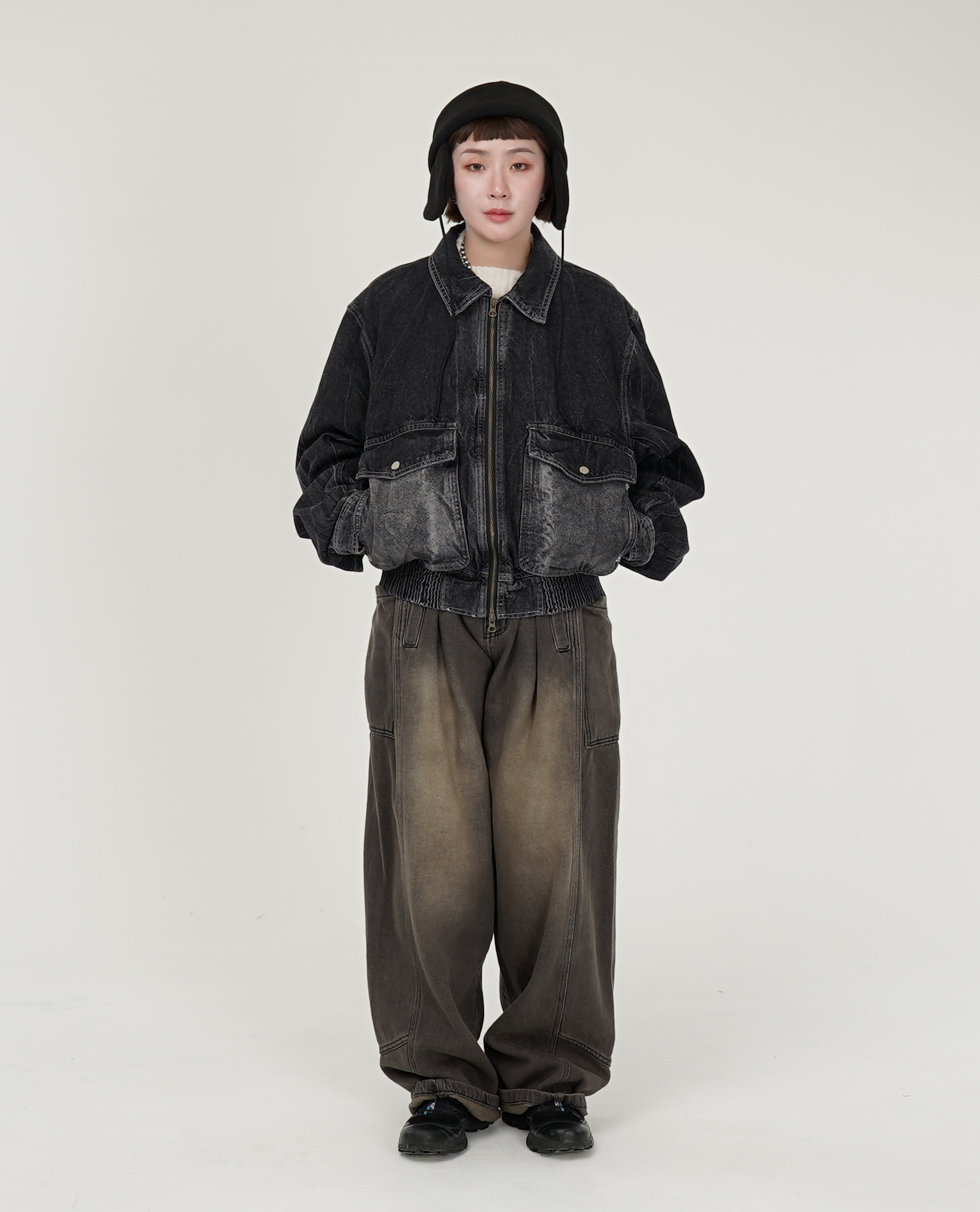 *看 Model 上衣:粗細條紋軟毛衣、拉鍊寬短水洗牛仔外套