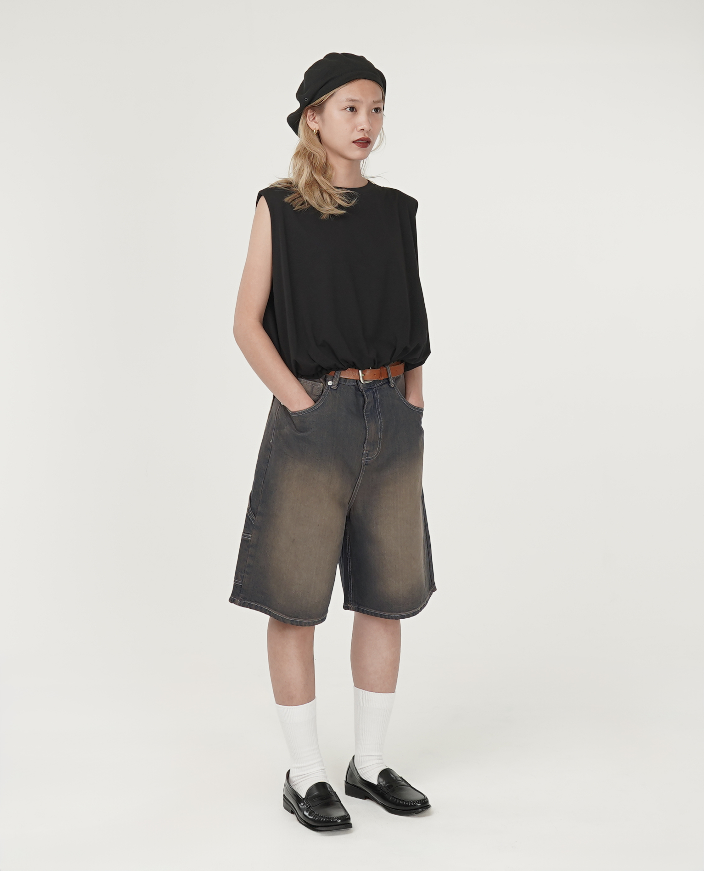 *看 Model 褲子:直筒拼接褲管刷色牛仔、漂色黑膝下畫家牛仔褲、直筒刷色牛仔褲、刷色膝下牛仔褲