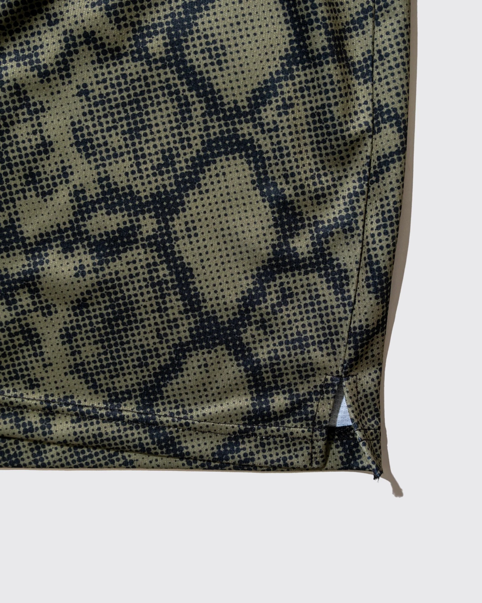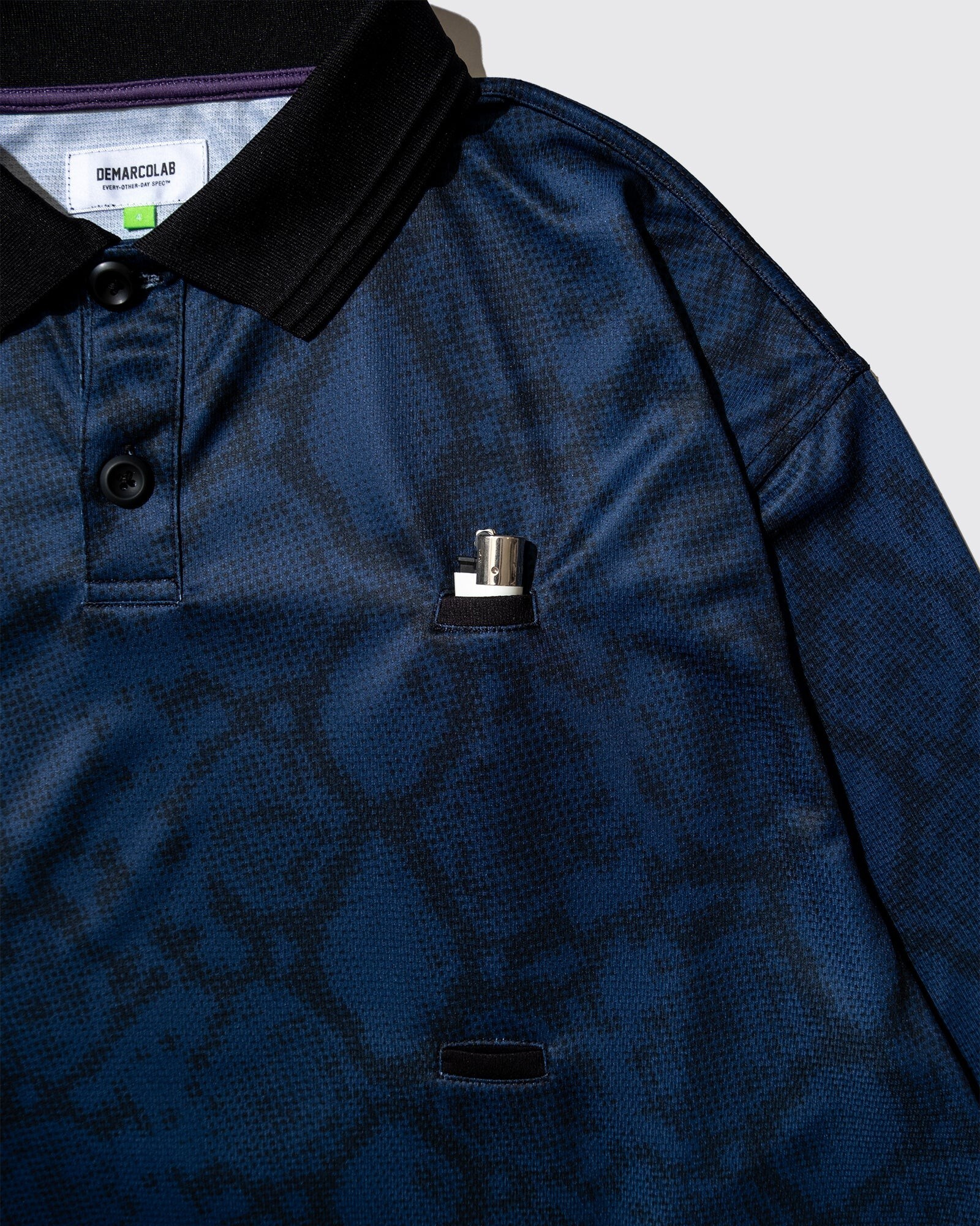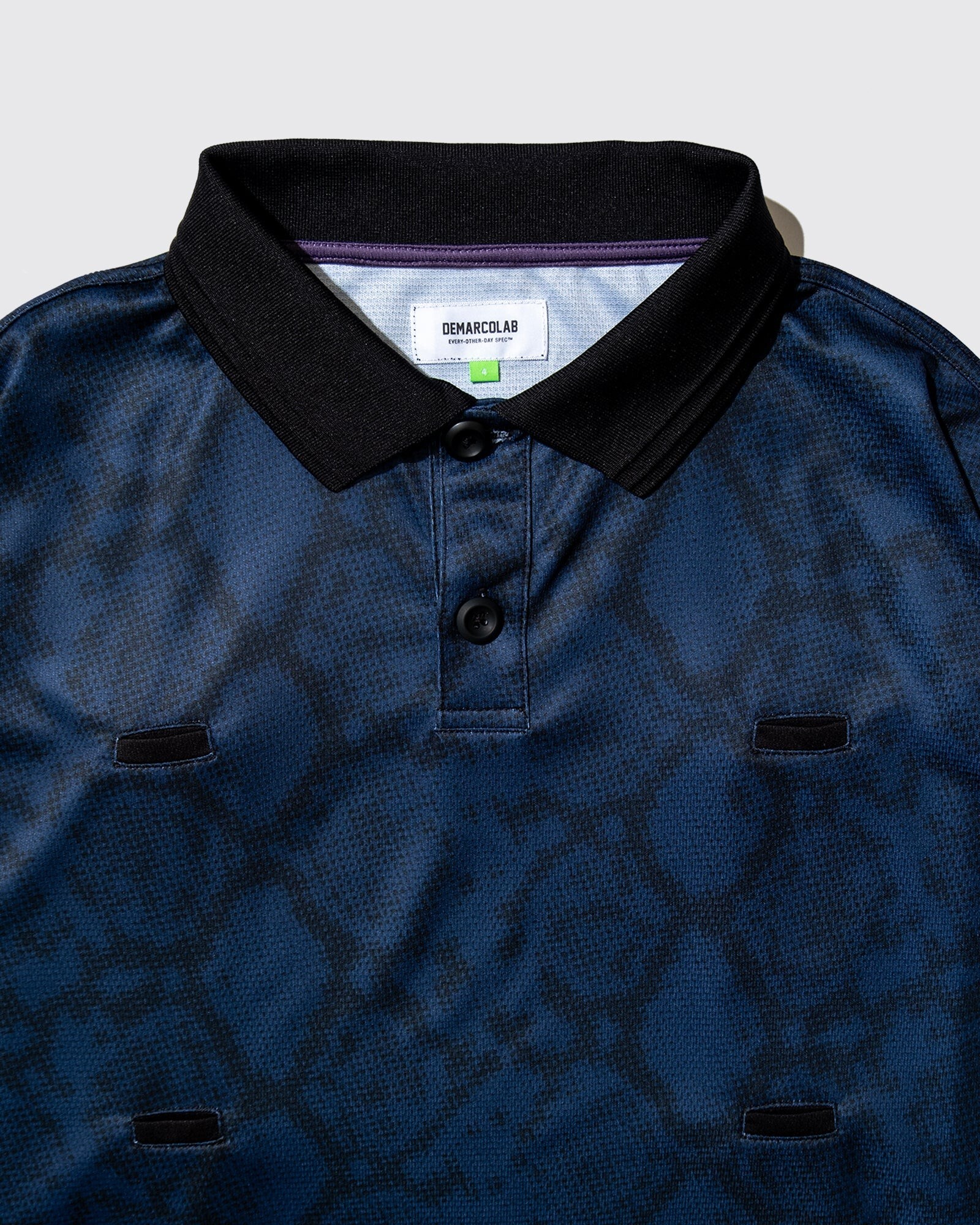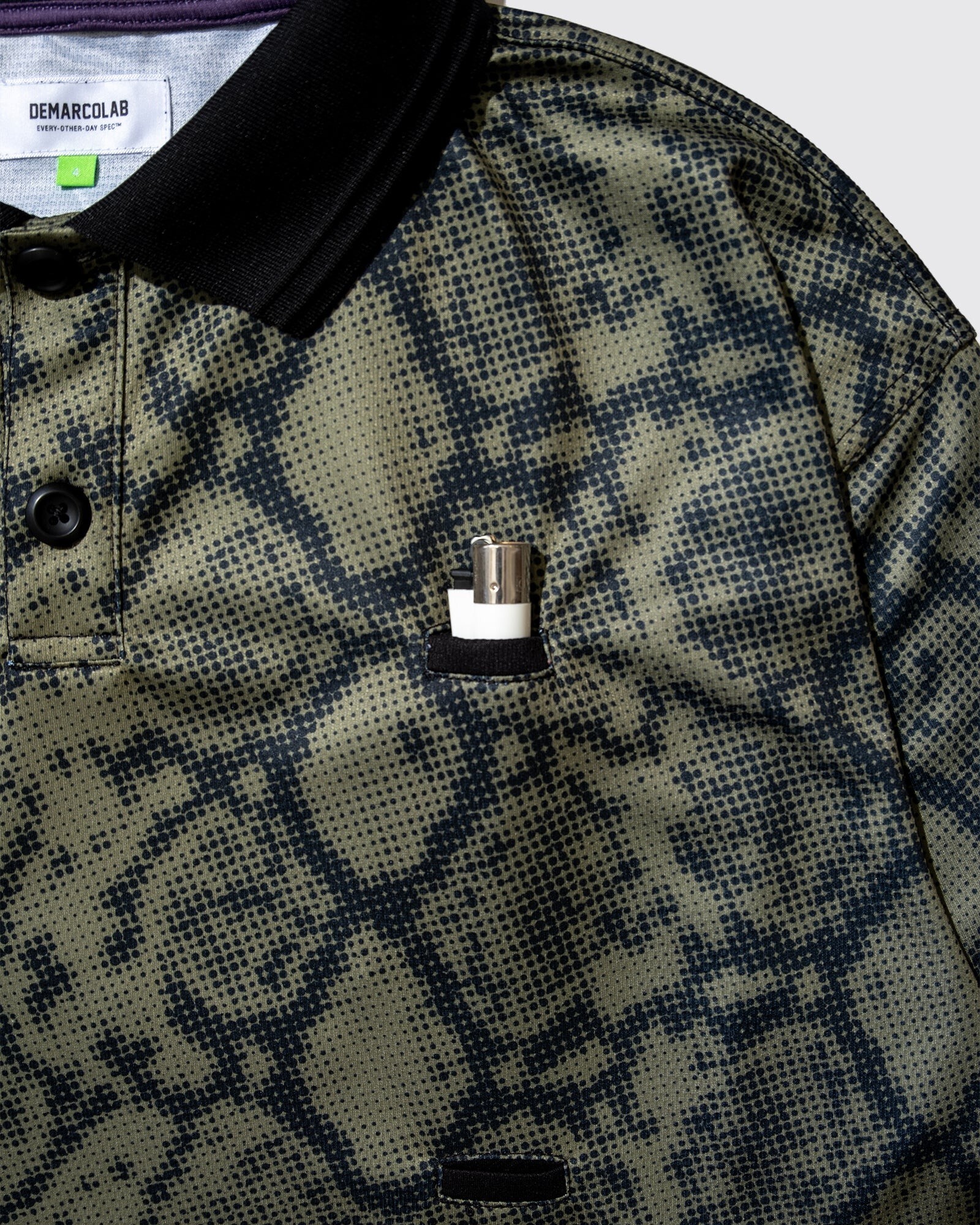 DEMARCOLAB PYTHON KUN S/S POLO 設計重點:吸濕快乾面料 / 滿版直噴印刷圖騰 / 前片多重口袋 / 特製立體線條領片 / 雷射雕刻品牌鈕釦