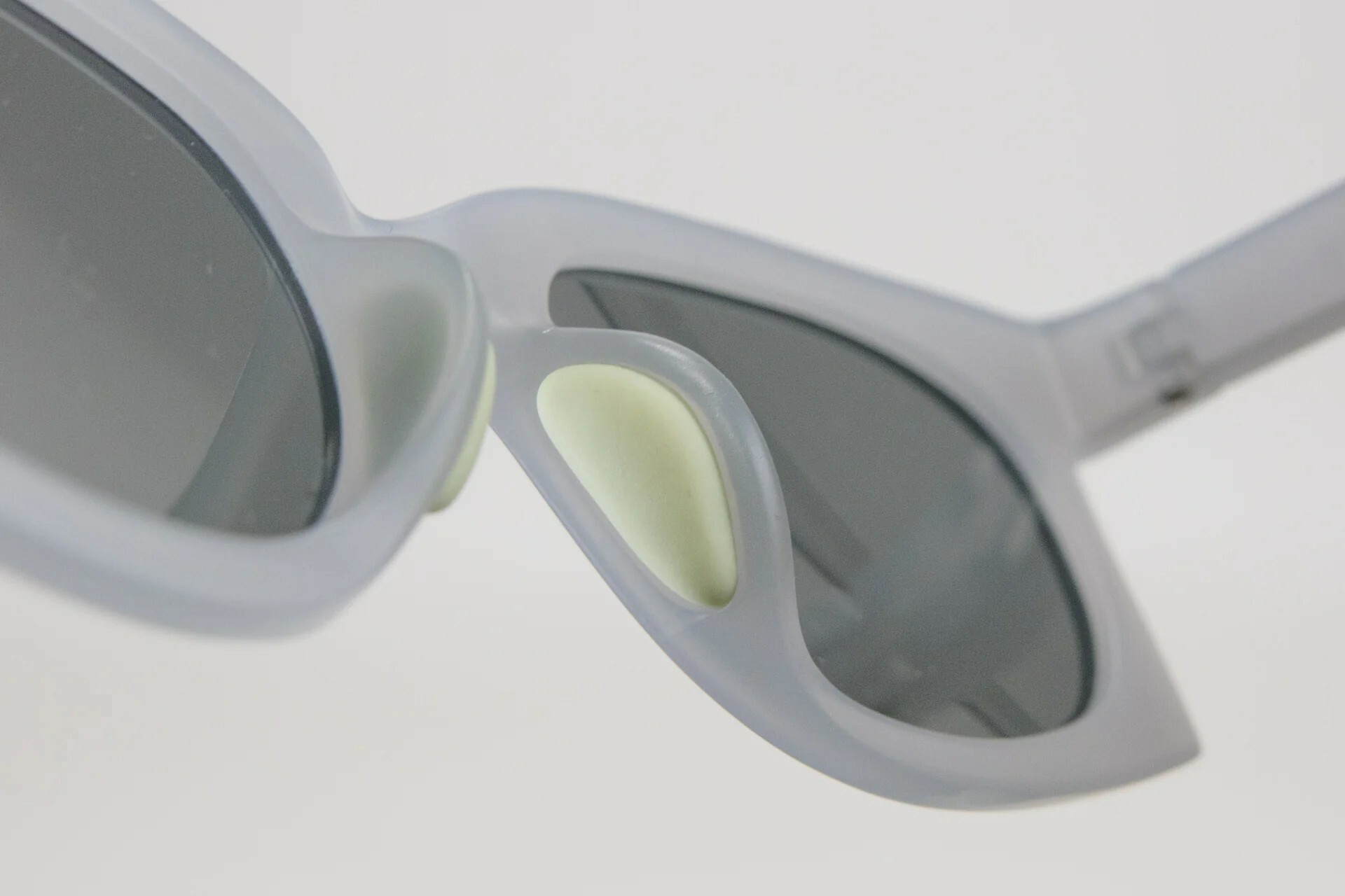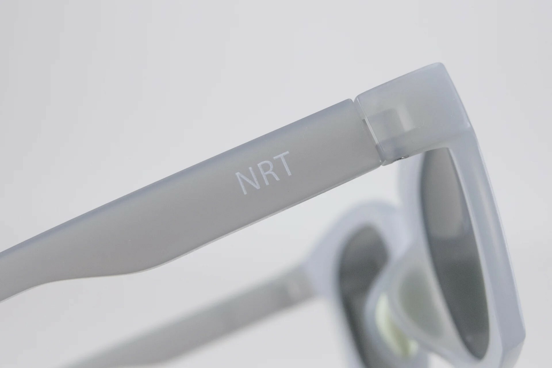 此款 LIGHT GREY 色的 NRT,鏡架呈現霧面消光、略微透明的淺灰色,以精緻的淡綠松石鏡尾夾為特色。