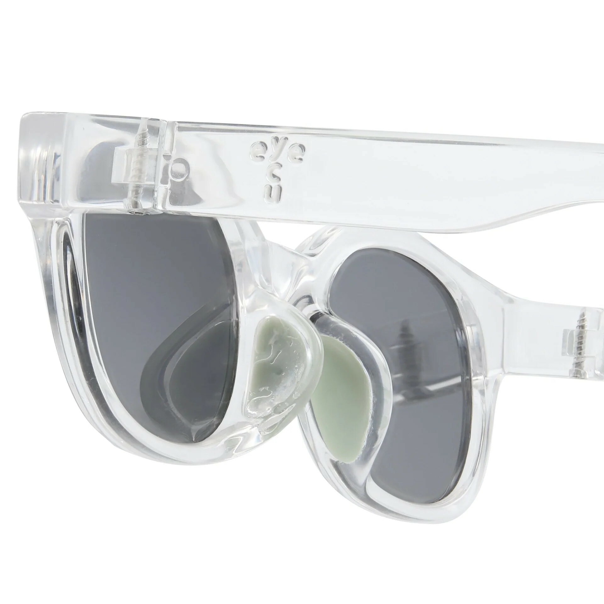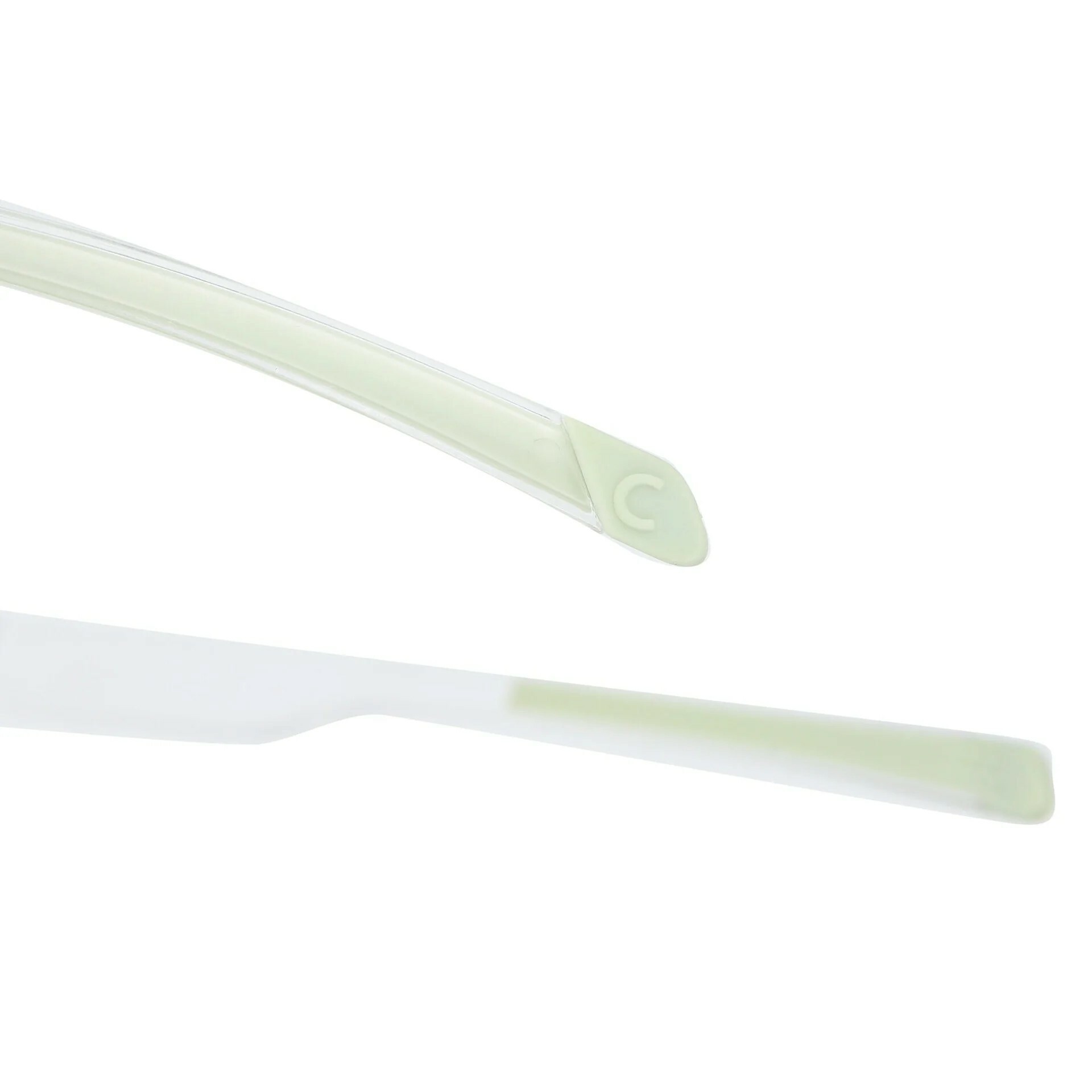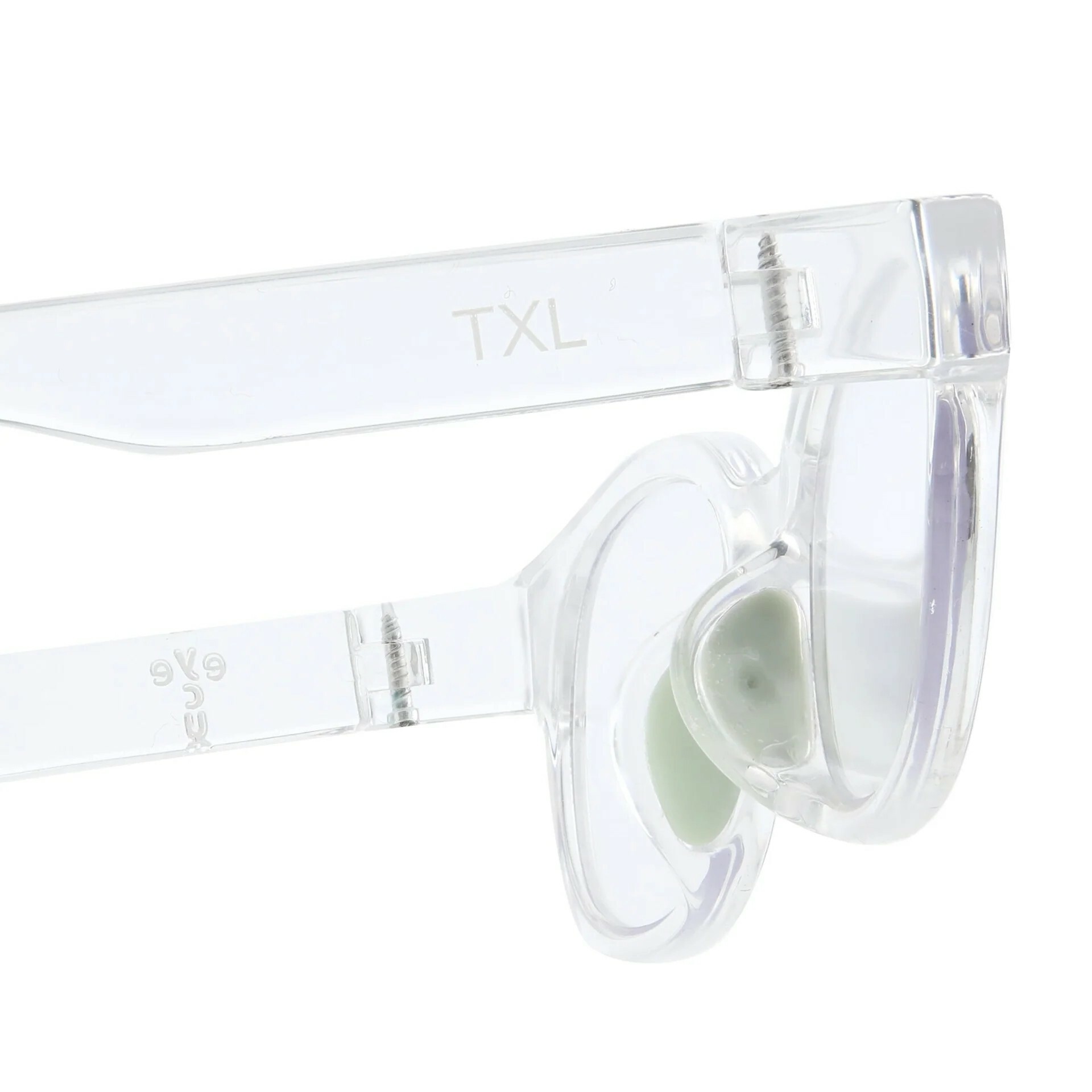 此款 CLEAR 色的 TXL 是 “CRYSTAL” 系列,一個完全透明和清晰的鏡框,以精緻的淡綠松石鏡尾夾為特色。