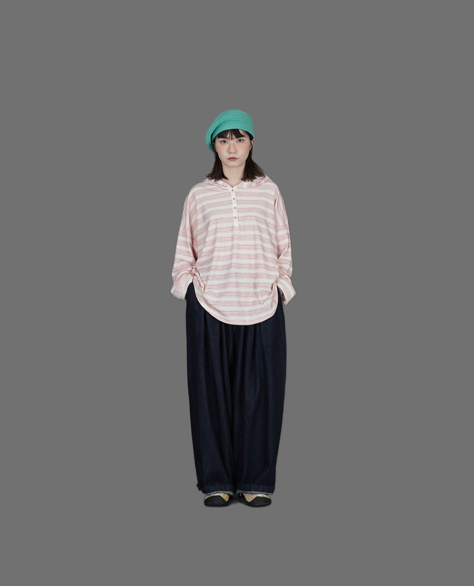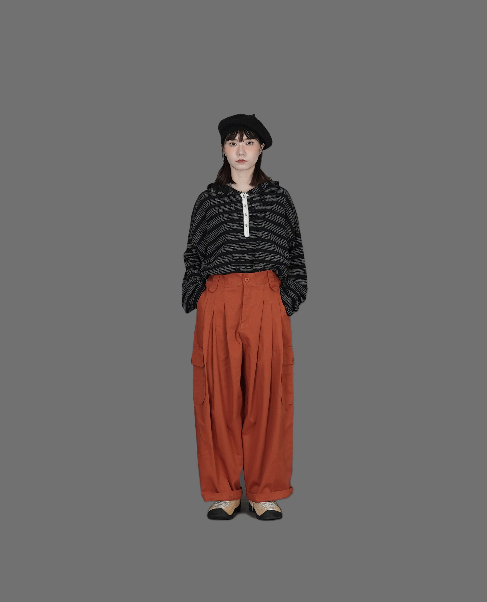 *看 Model 褲子:內綁繩鬆緊腰繭形牛仔、鬆緊中長A字裙、六打摺寬工作褲