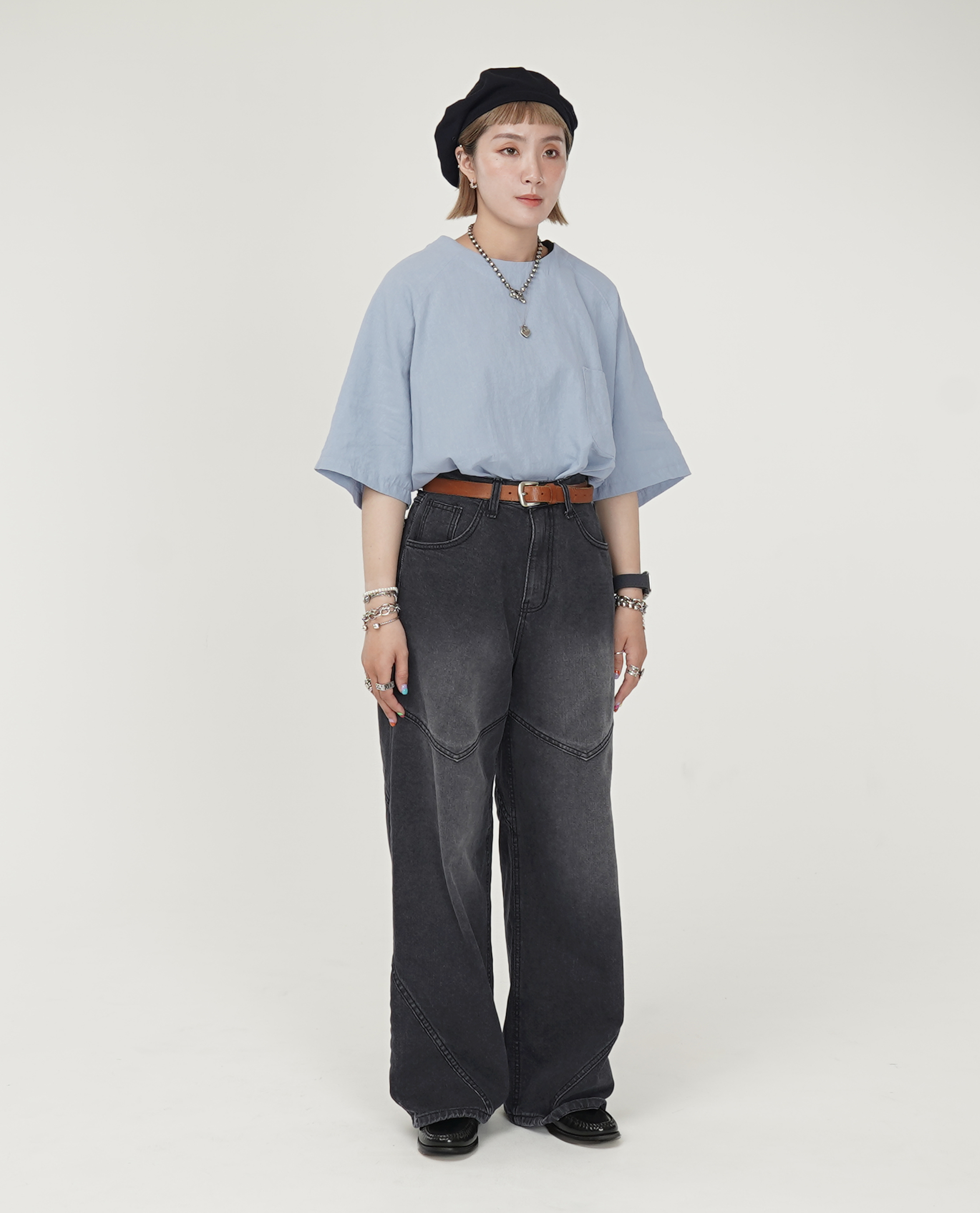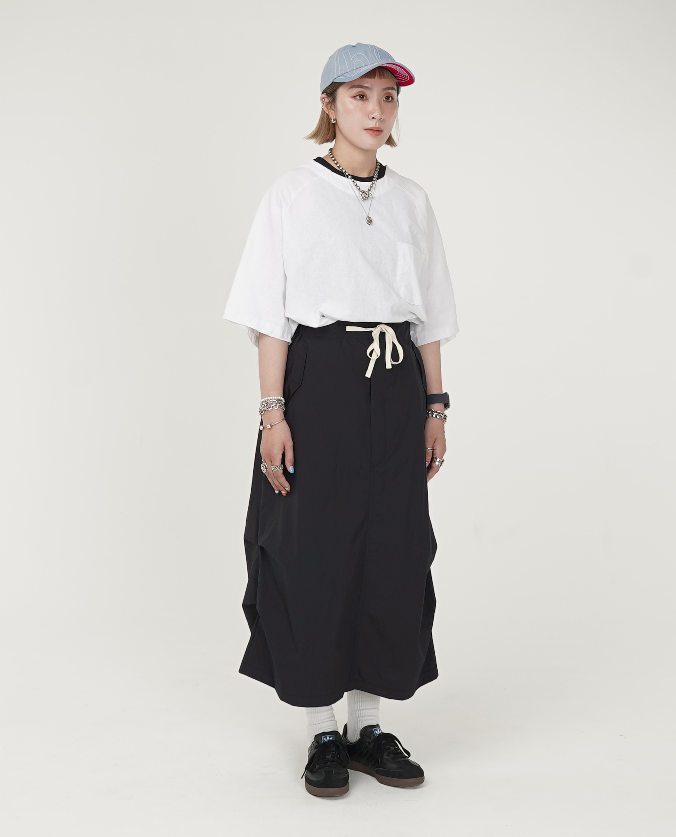 *看 Model 褲子:大方口袋下不收邊膝下褲、V型車線刷色牛仔、滑料綁帶裙