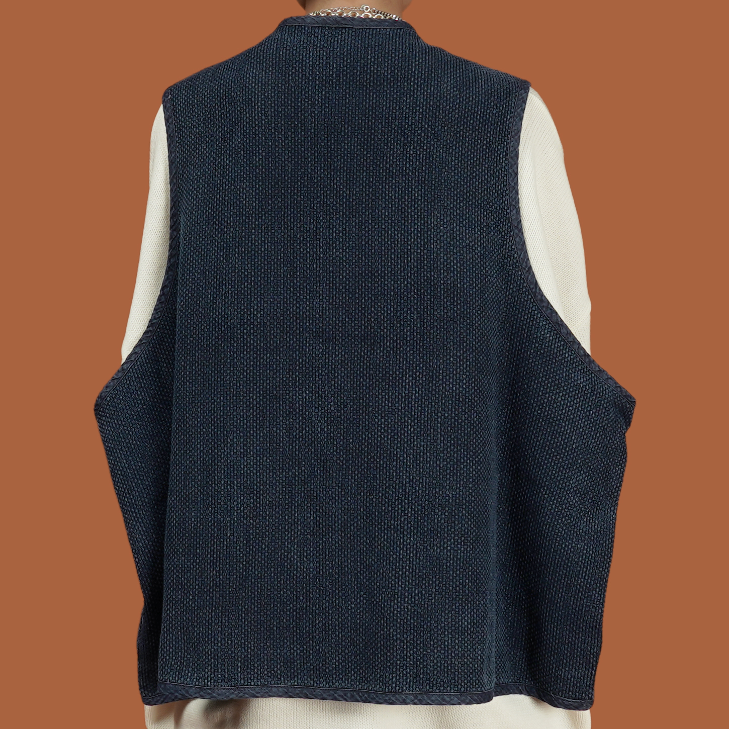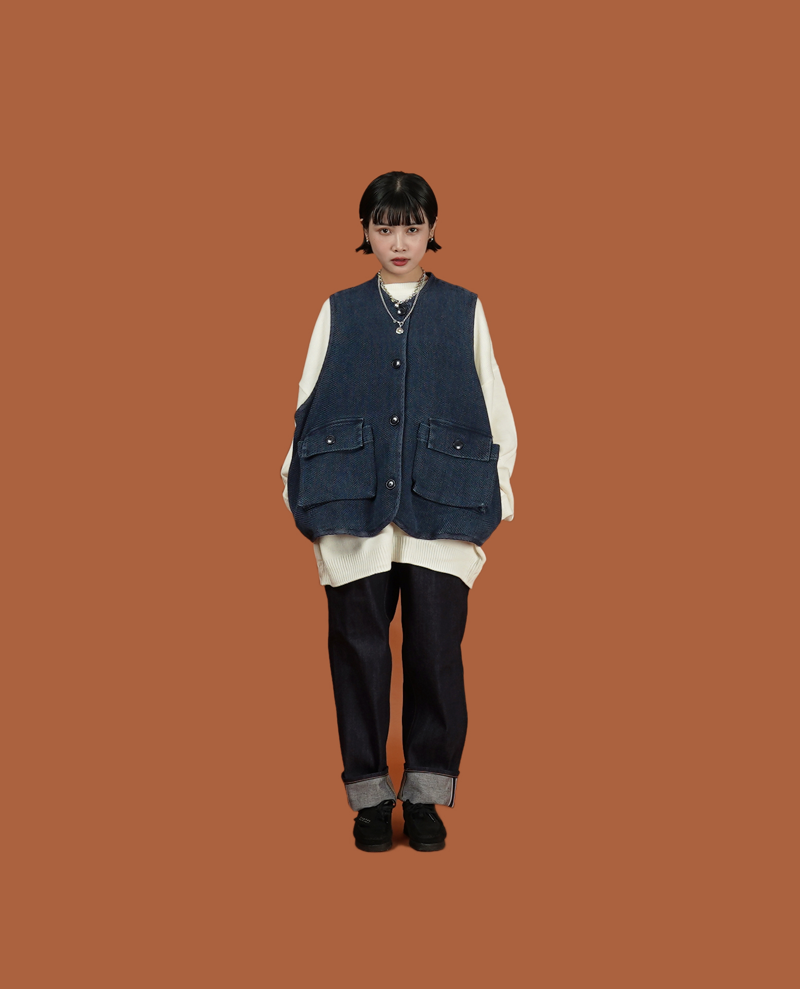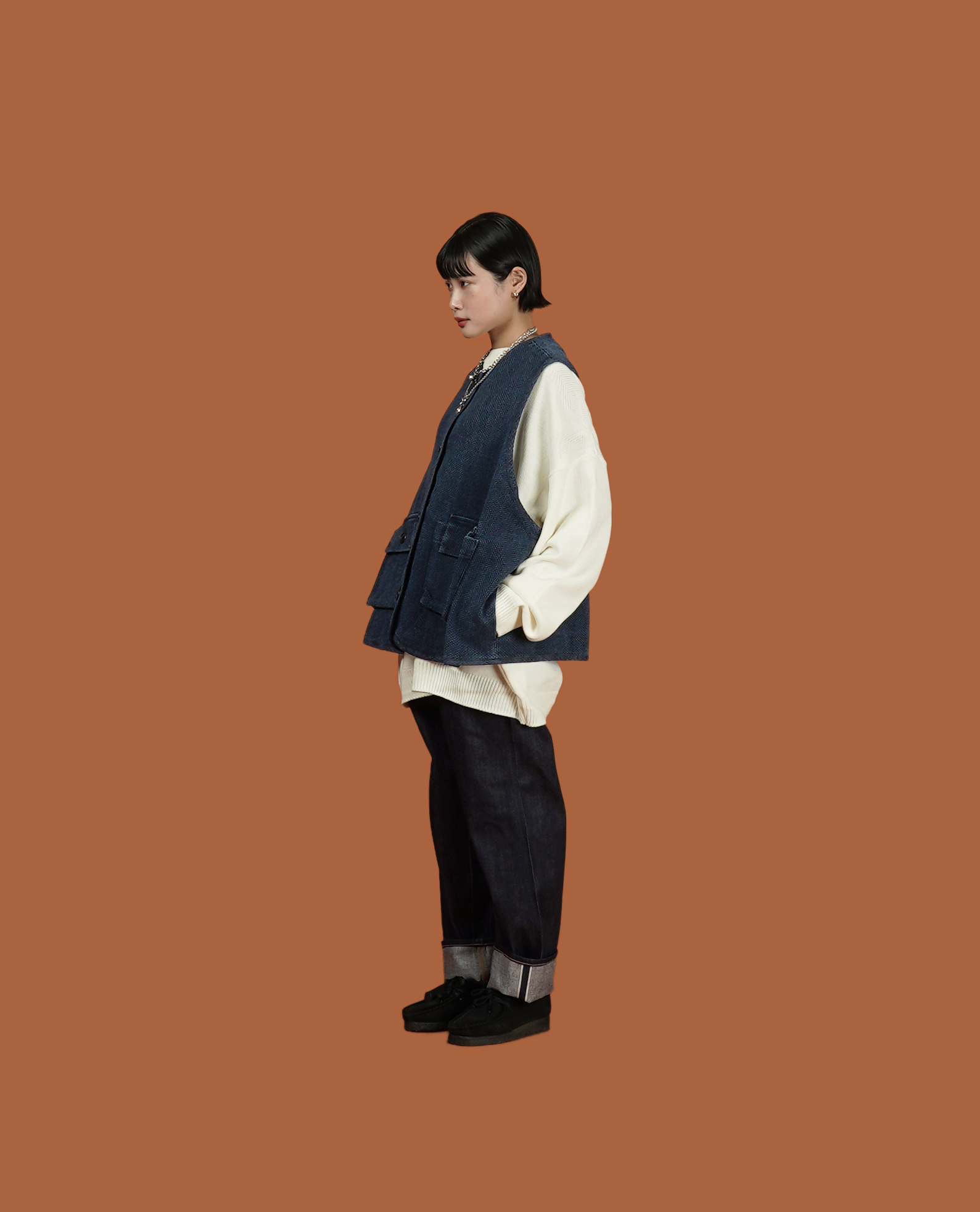 並使用經緯靛藍染色,可以感受日本獨有的紡織工法:靛藍繩染工法+硫化混合物,成品會產生略帶綠的獨特顏色。