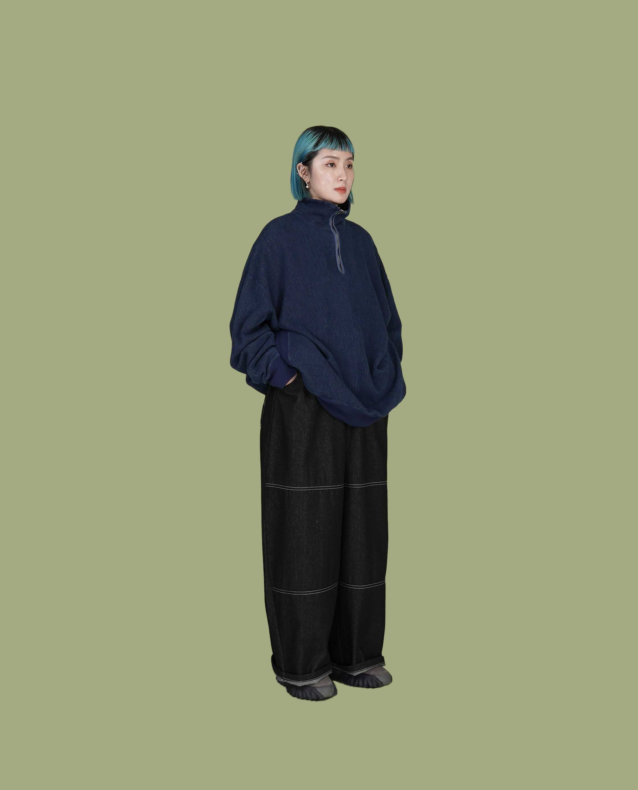 經紗與緯紗採用筒紗純靛藍繩染,反複染色氧化處理的日式靛藍紗線,日本藍搭配立體編織結構,形成更深邃的面料。