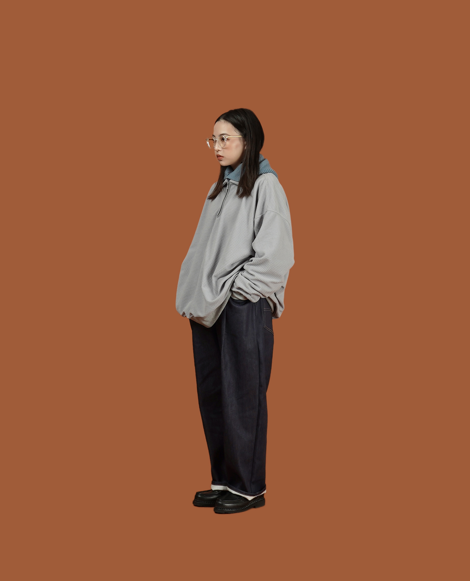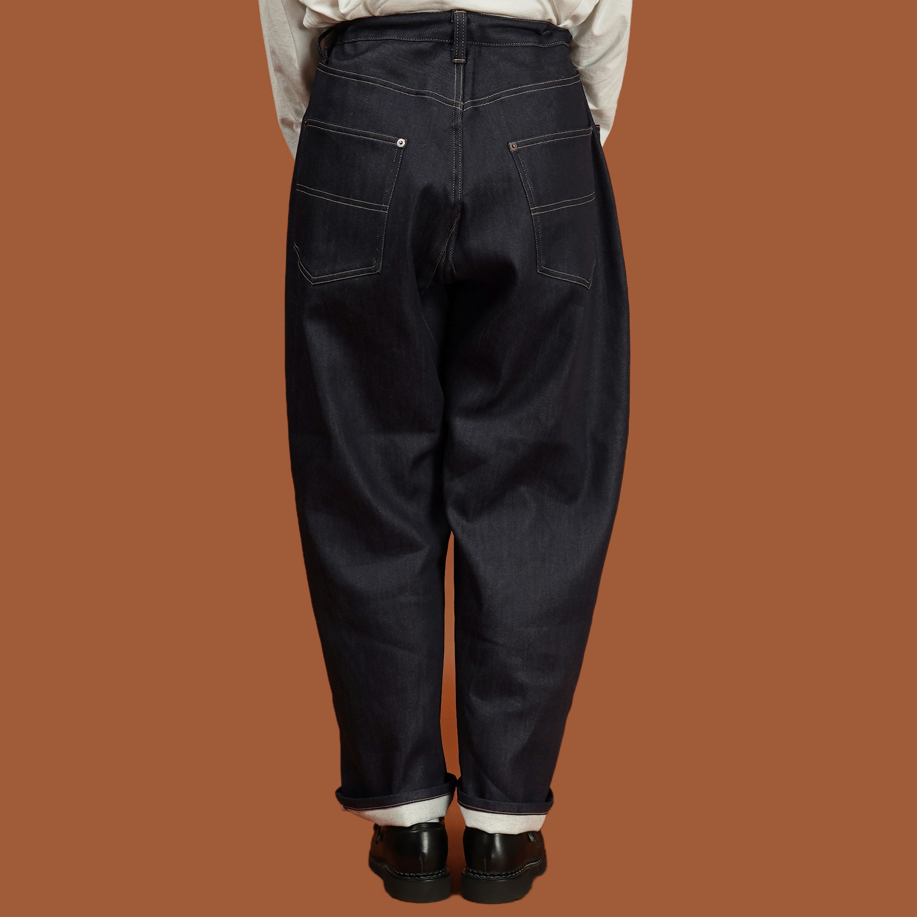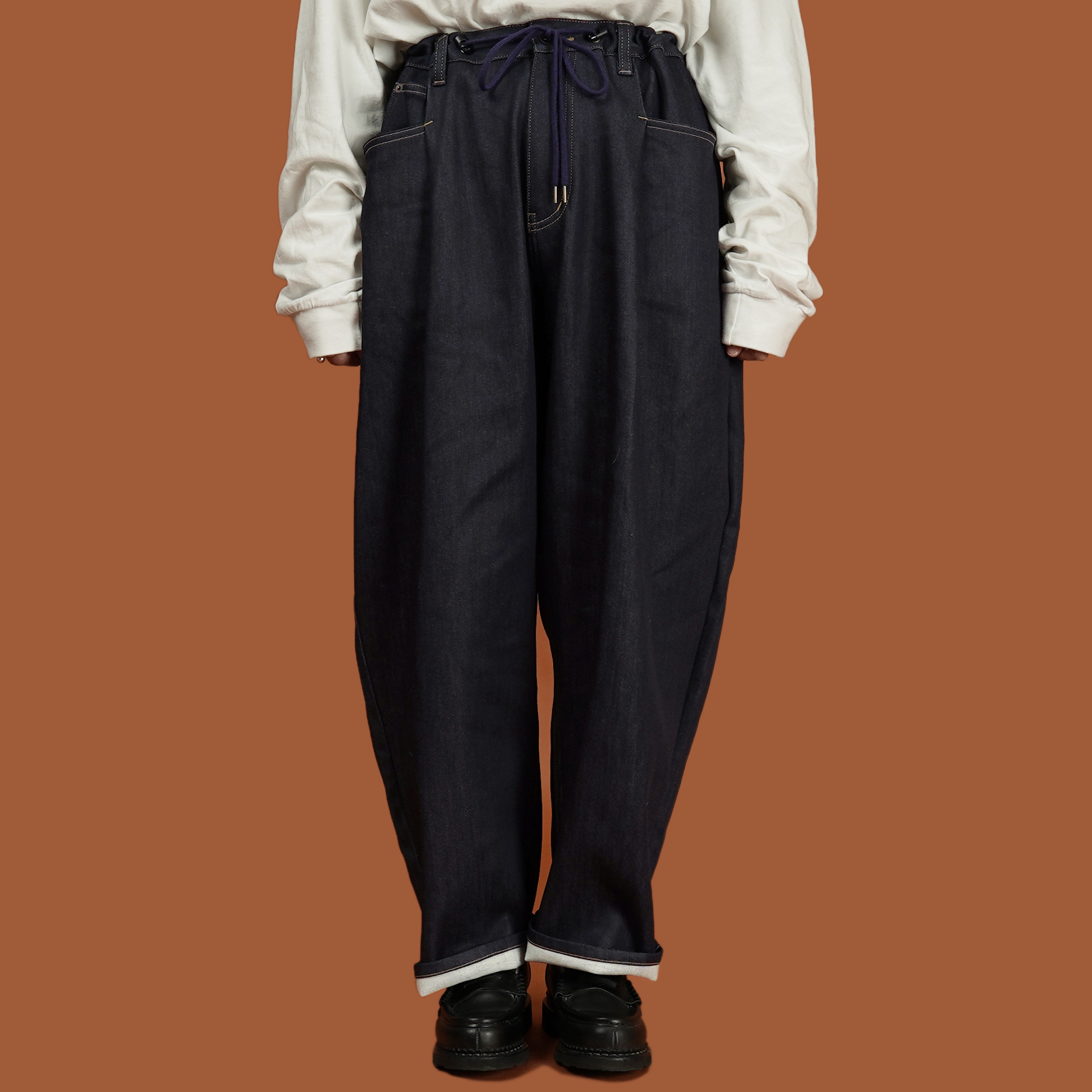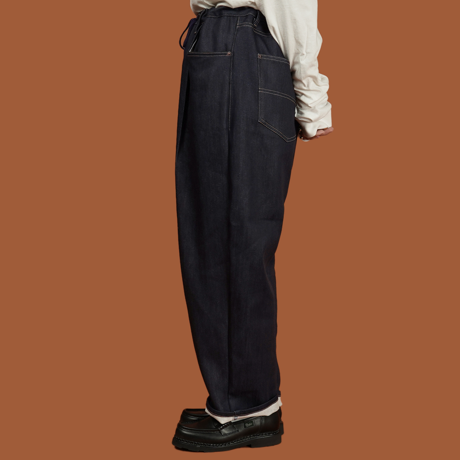 日本國內產針織 Indigo 丹寧布,面料內裡針織成微刷毛的質地,不僅有適當的厚度,也有著非常柔軟的觸感,