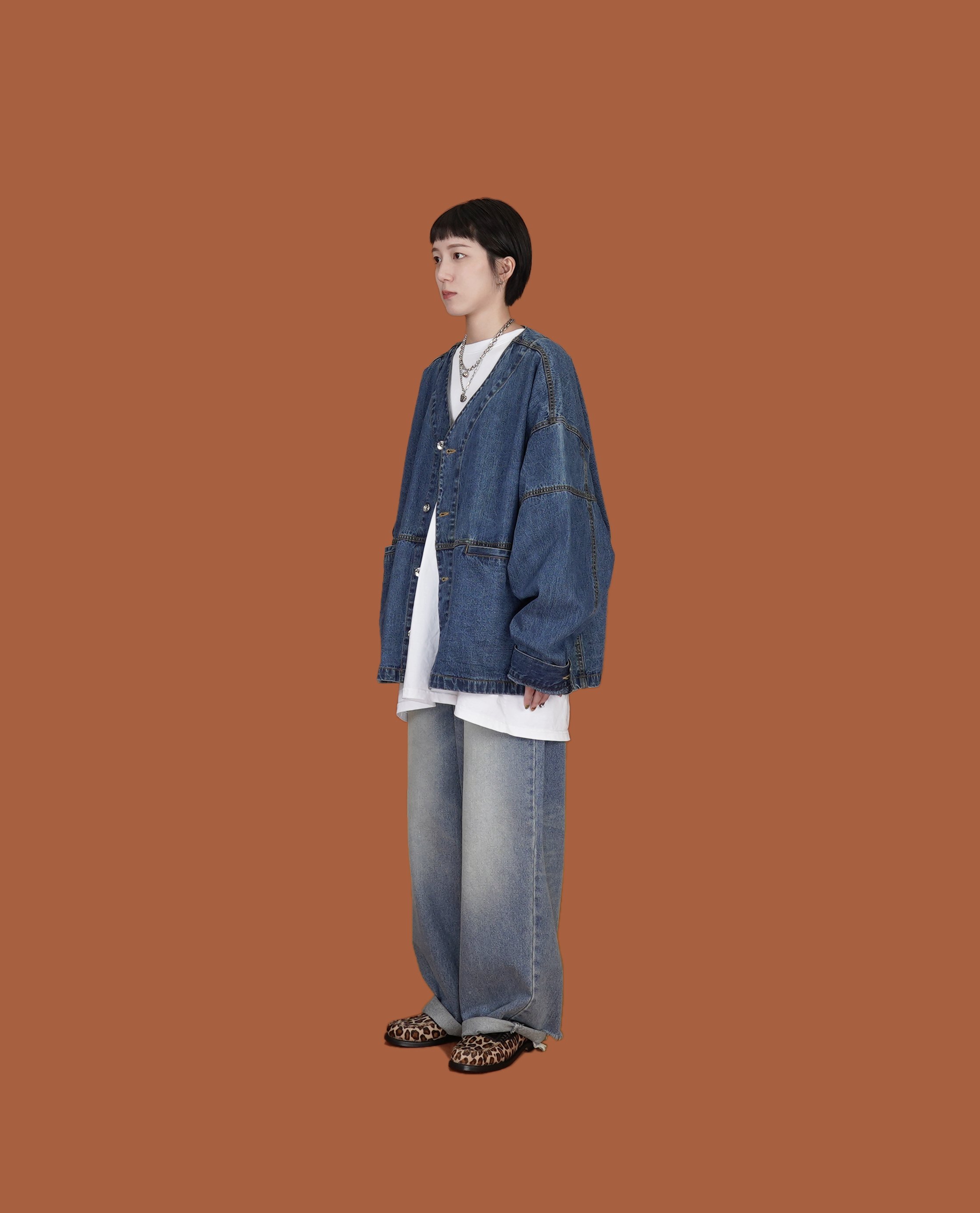 *看 Model 褲子:寬版側拼接牛仔褲、刷色高腰褲腳刷破牛仔