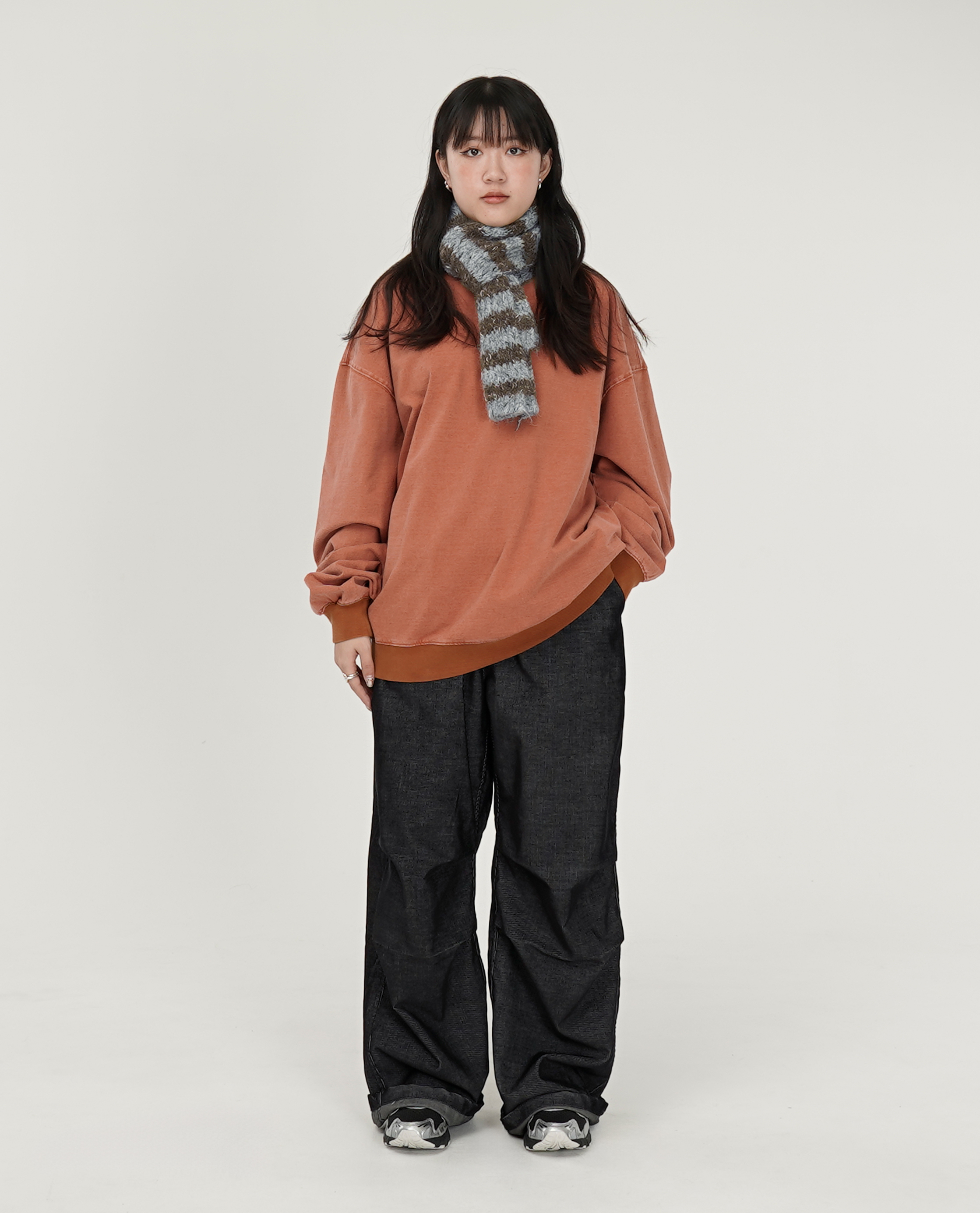 *看 Model 褲子:前車線刷色牛仔工作褲、鬆緊腰膝抓皺細燈芯褲