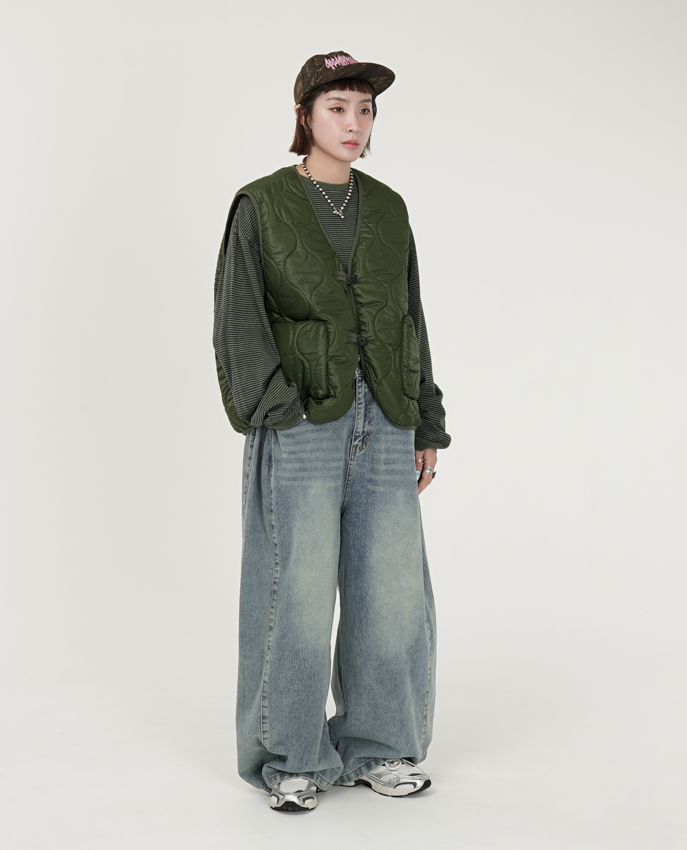 *看 Model 褲子:高腰抓皺下可縮工作長裙、腰可調拼接牛仔