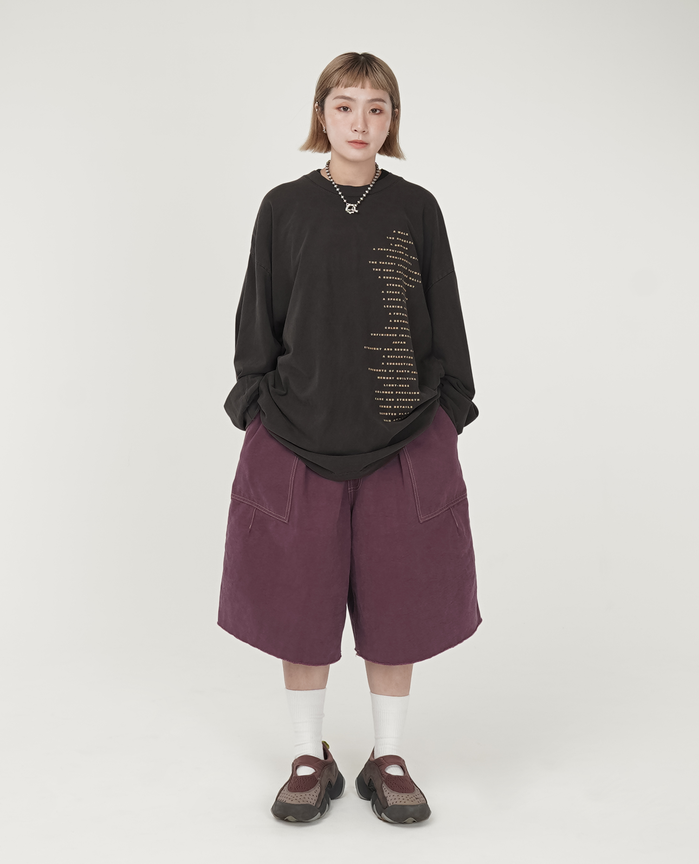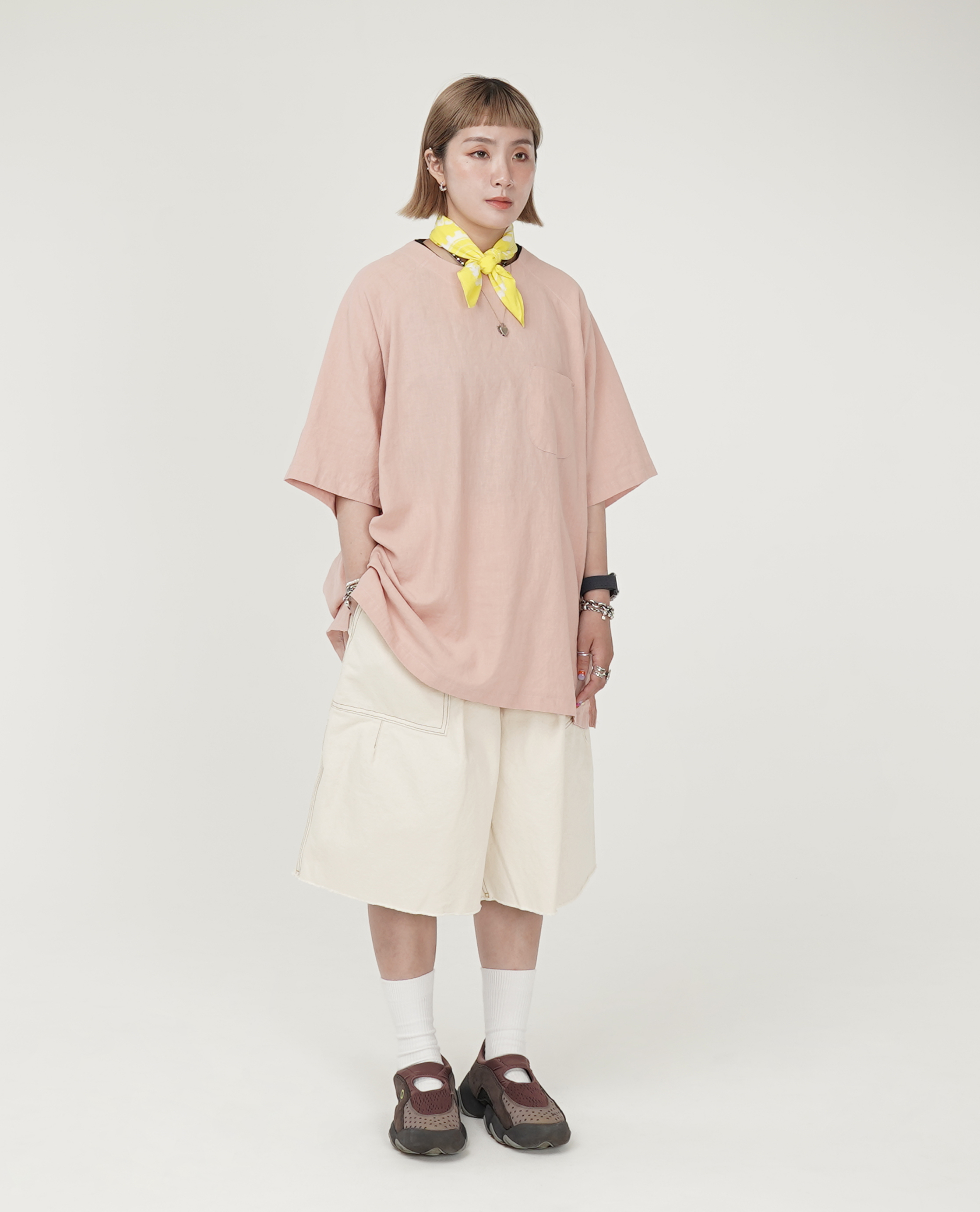 *看 Model 上衣:b.Eautiful Vapor Logo T-Shirt - 24 SS、麻料下擺弧形口袋t、b.Eautiful x WAKA WAKA A Future LS T-Shirt - 24 SS