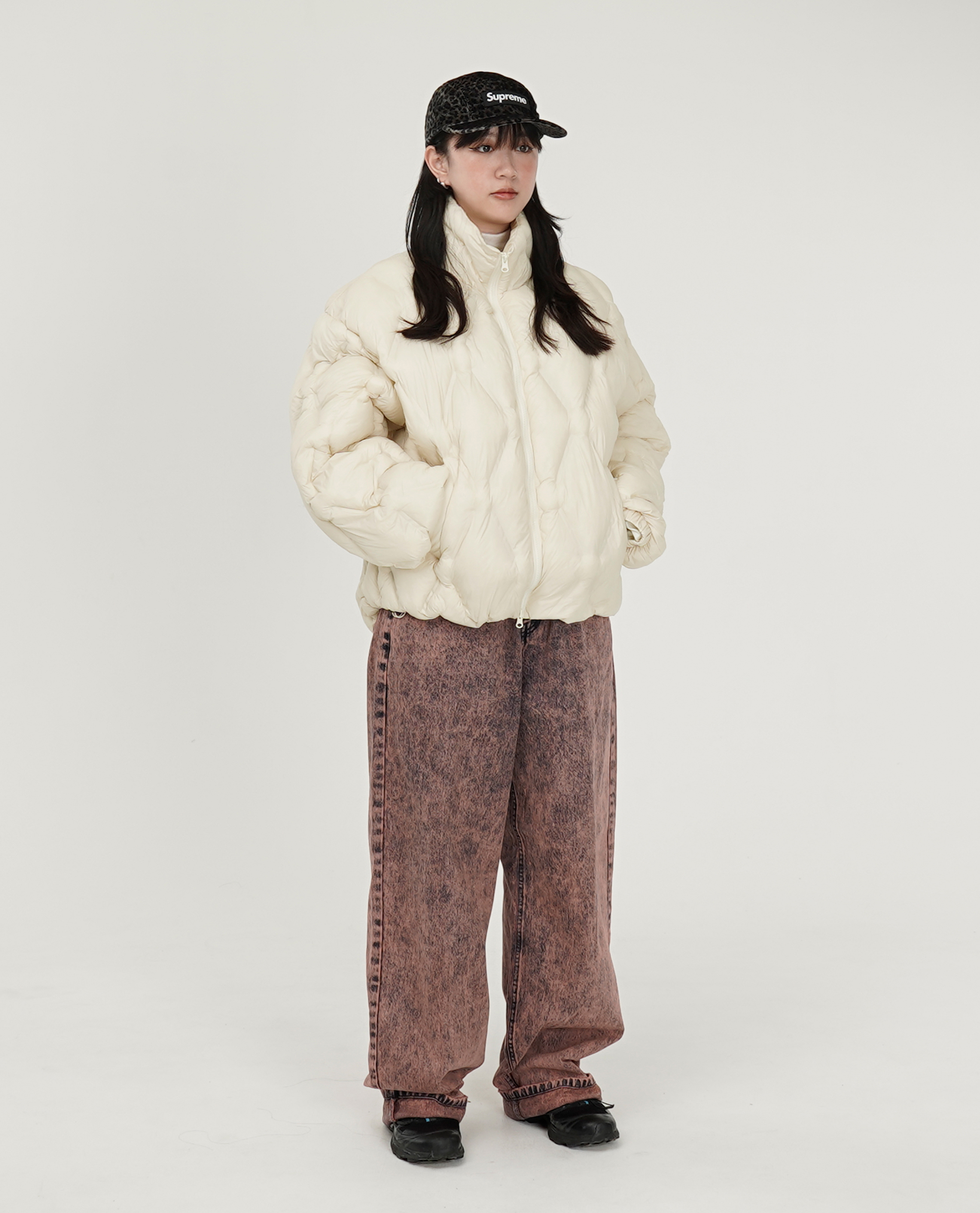 *看 Model 褲子:刷白大弧形膝車線牛仔、漂粉直筒牛仔