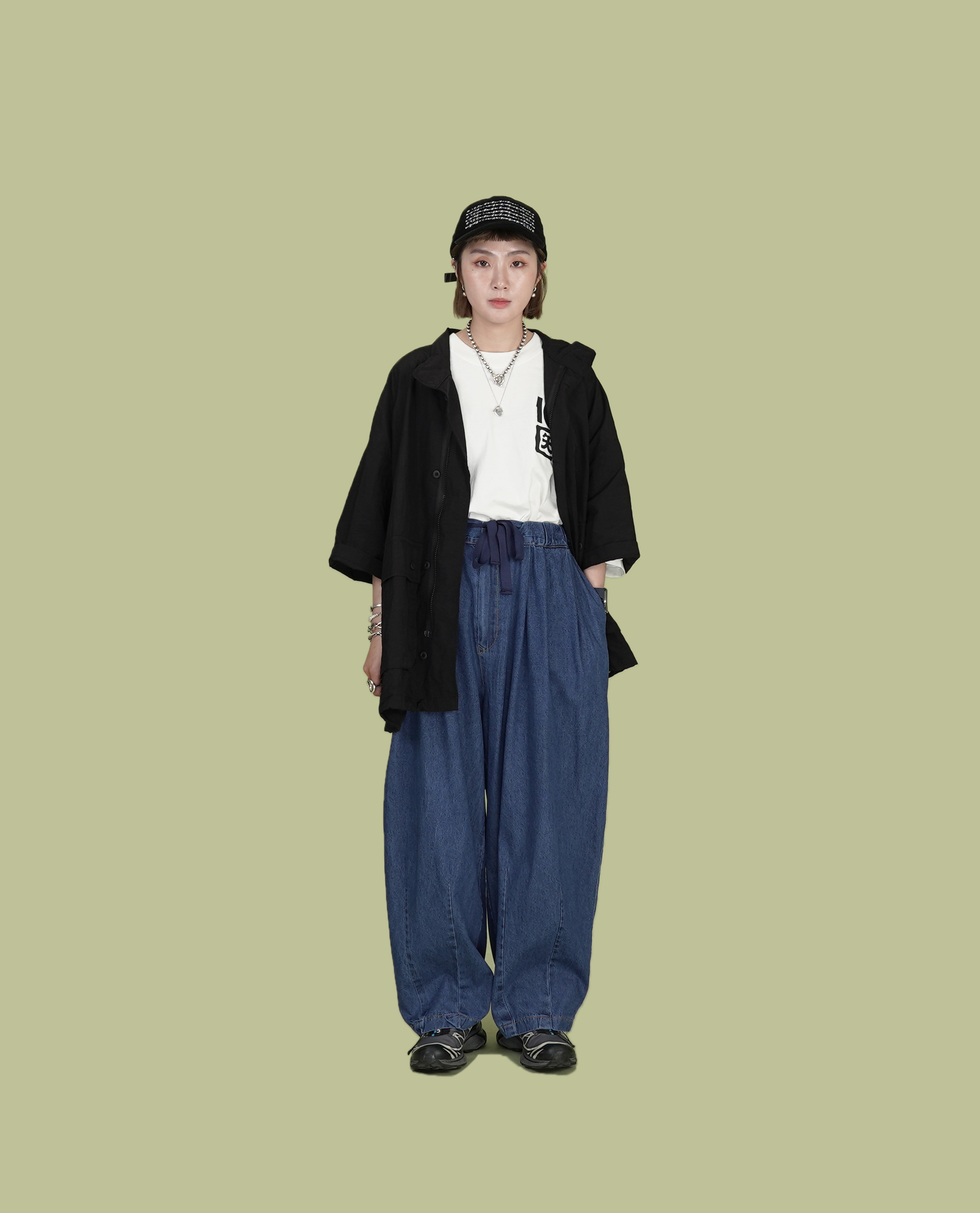 * Model 褲子:膝上前摺後鬆緊牛仔側雙車線直筒牛仔下車線前摺寬牛仔