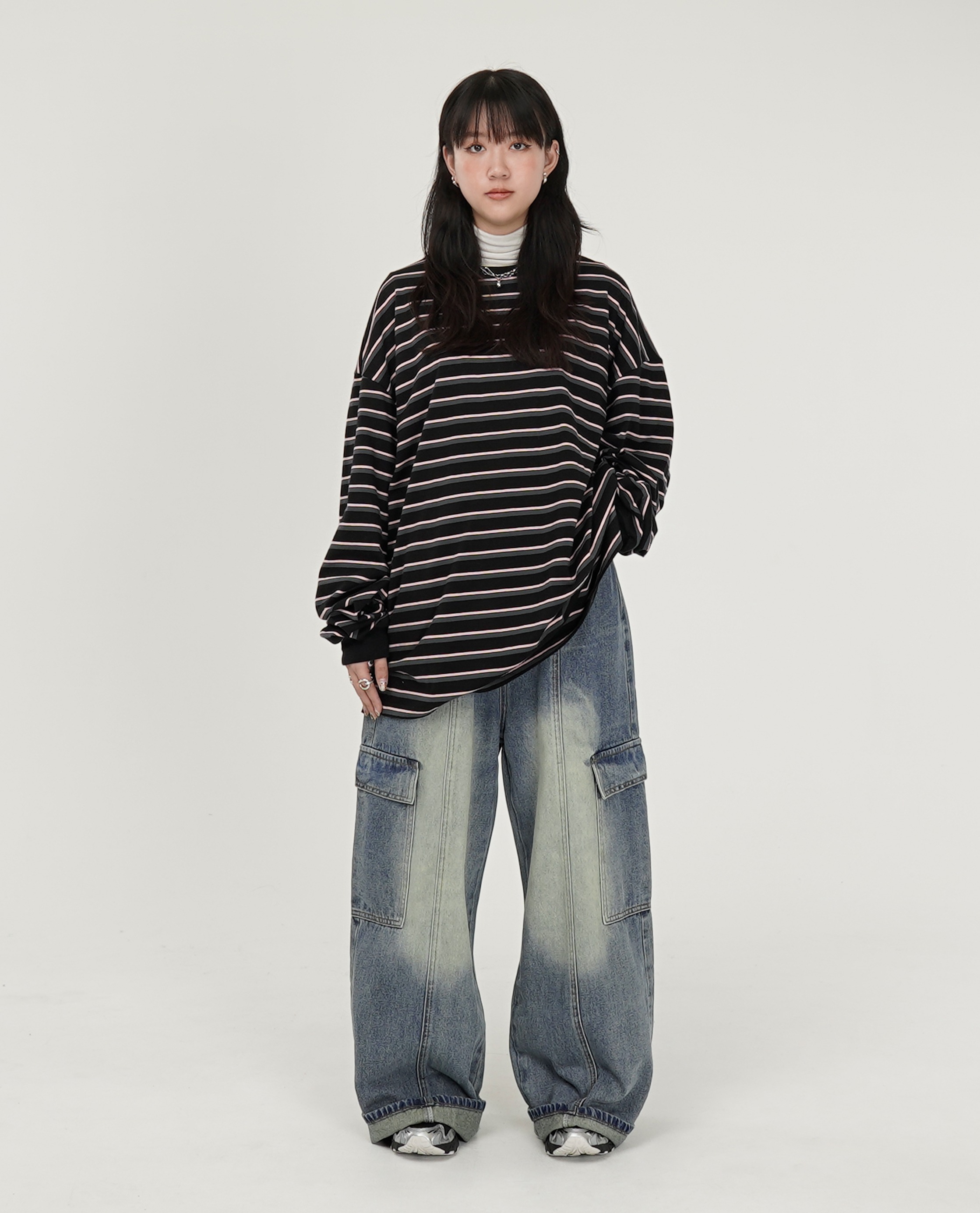 *看 Model 褲子:漂粉直筒牛仔、前車線刷色牛仔工作褲