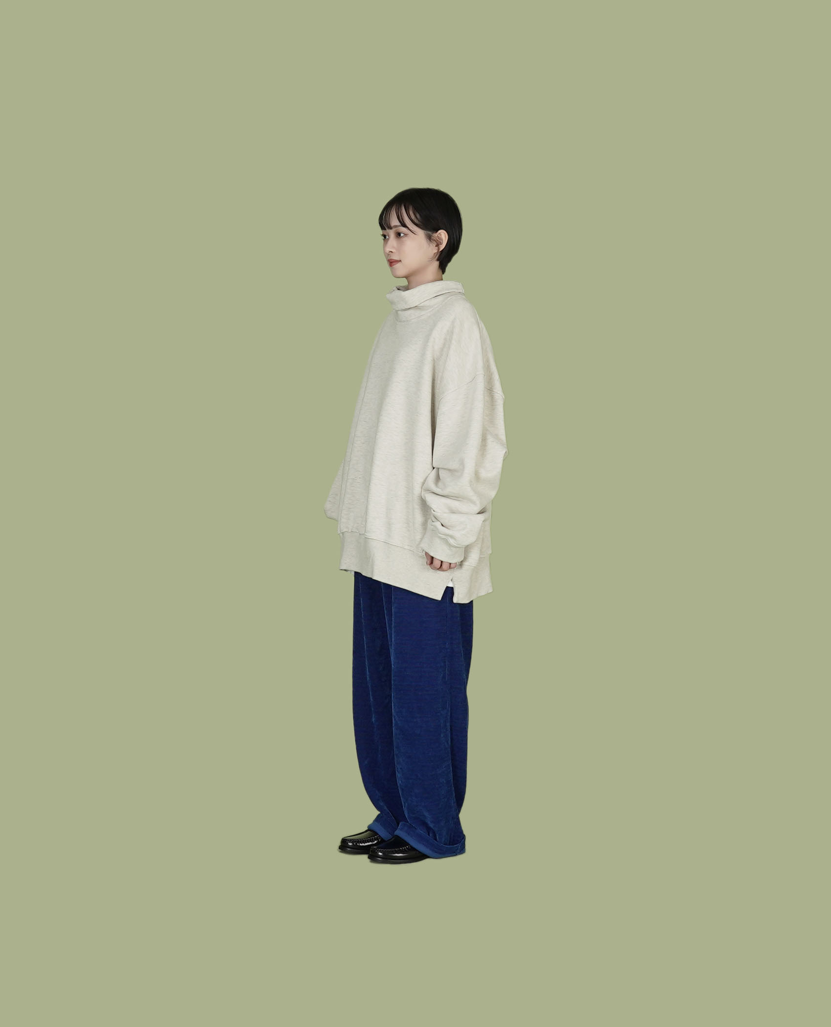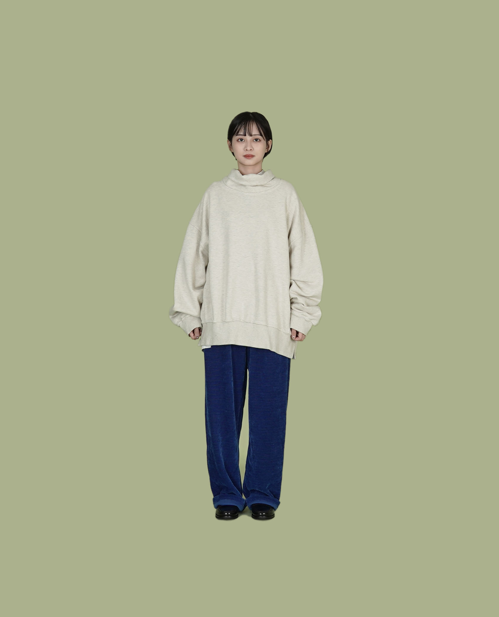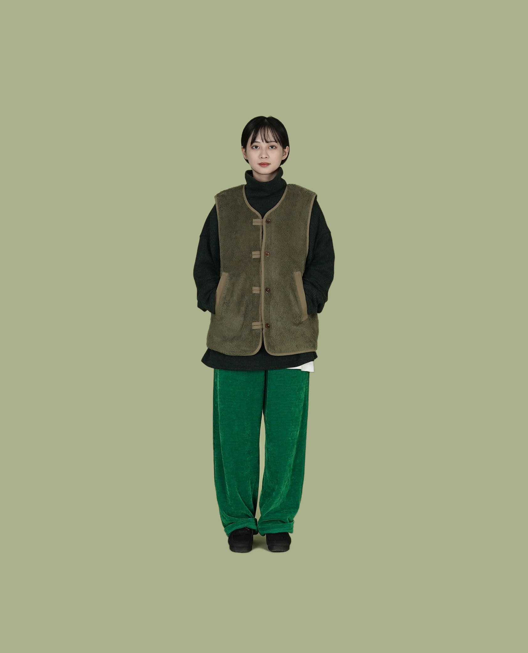 * Model 上衣:大高領落肩大學t釦子雙面穿抓絨背心