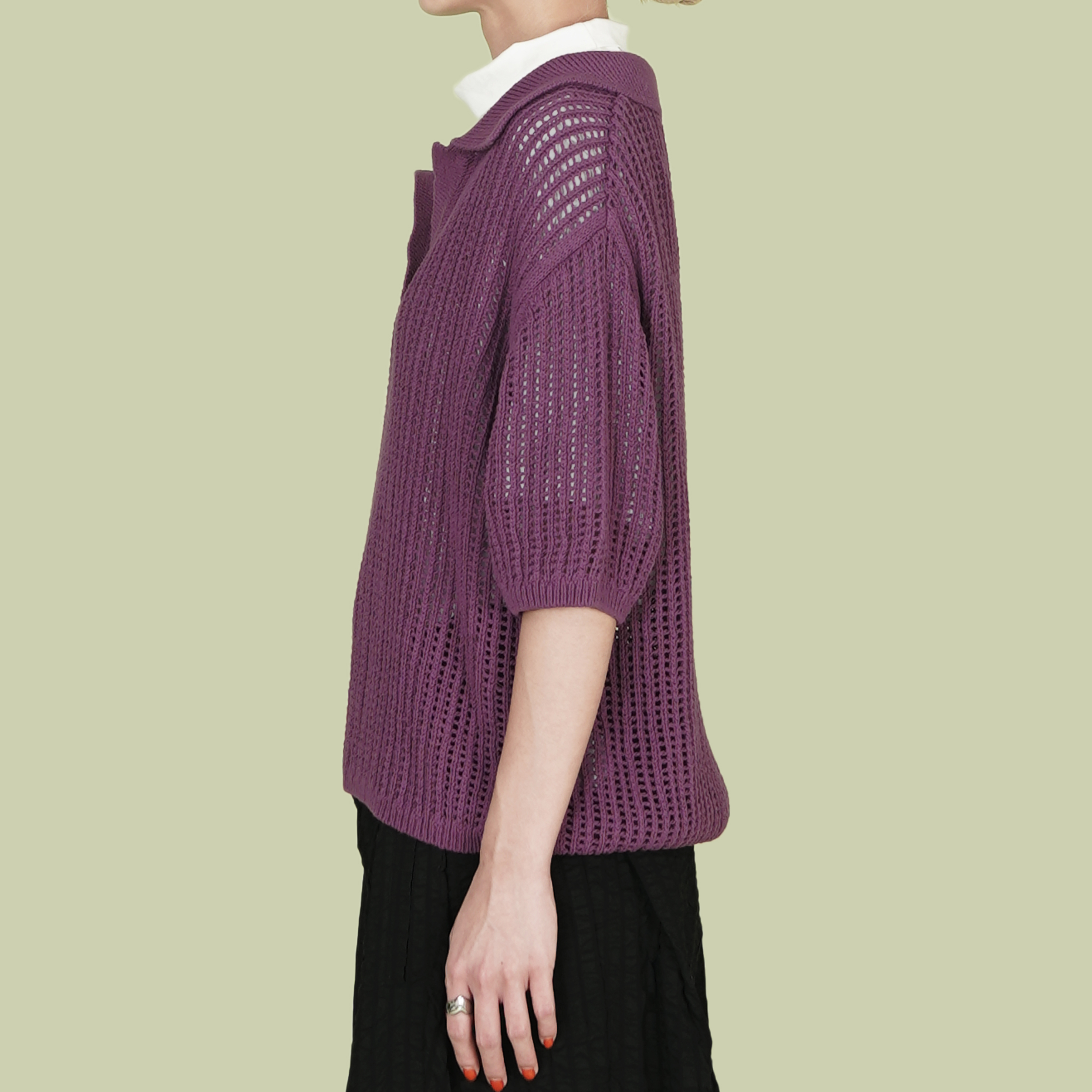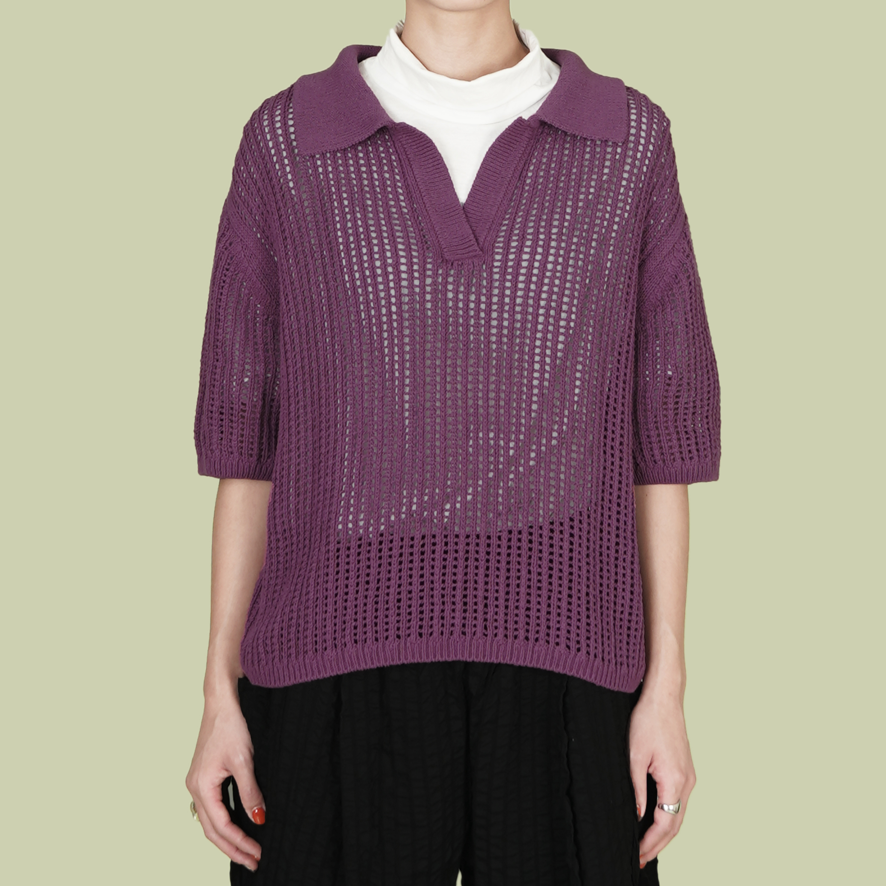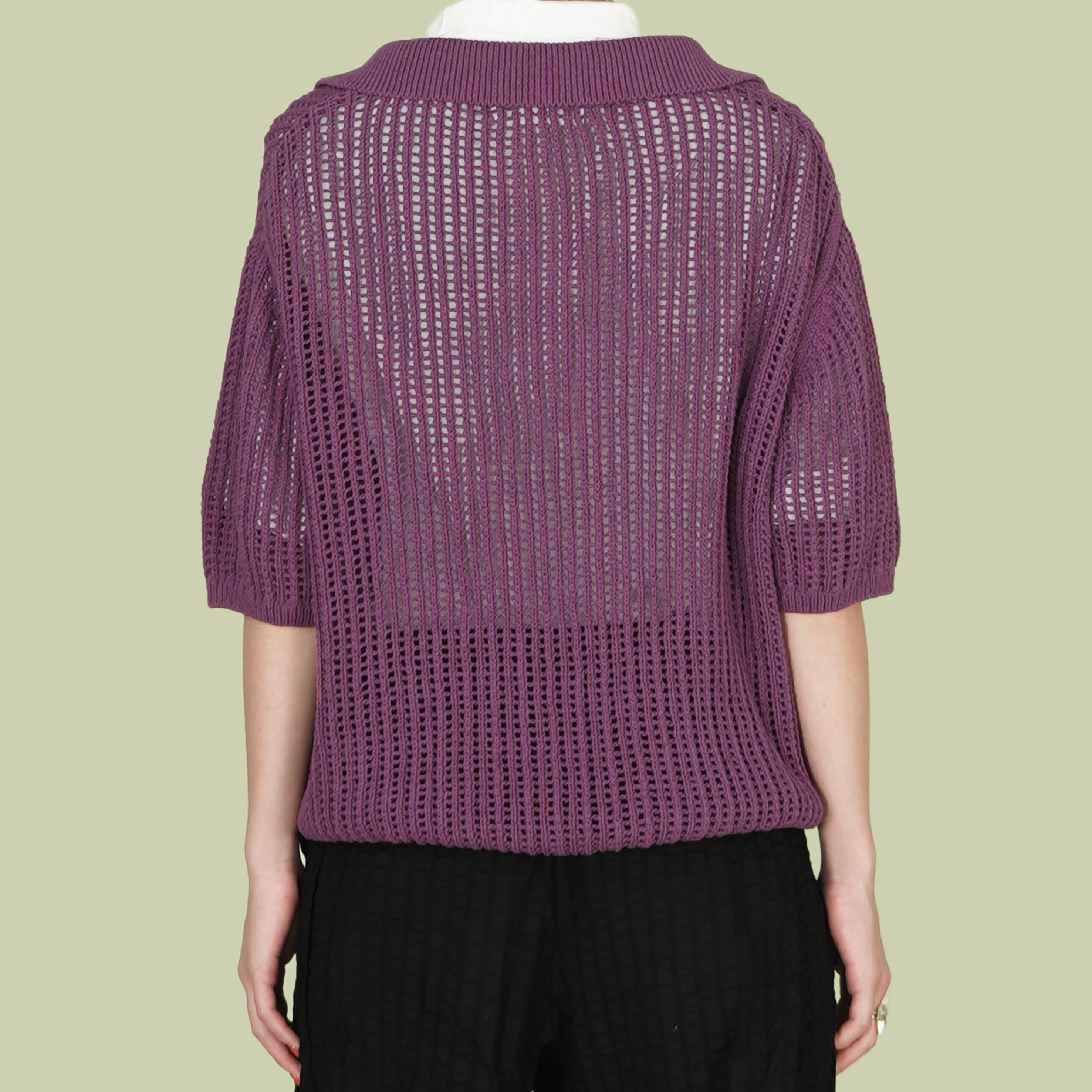 V領半袖洞洞針織上衣