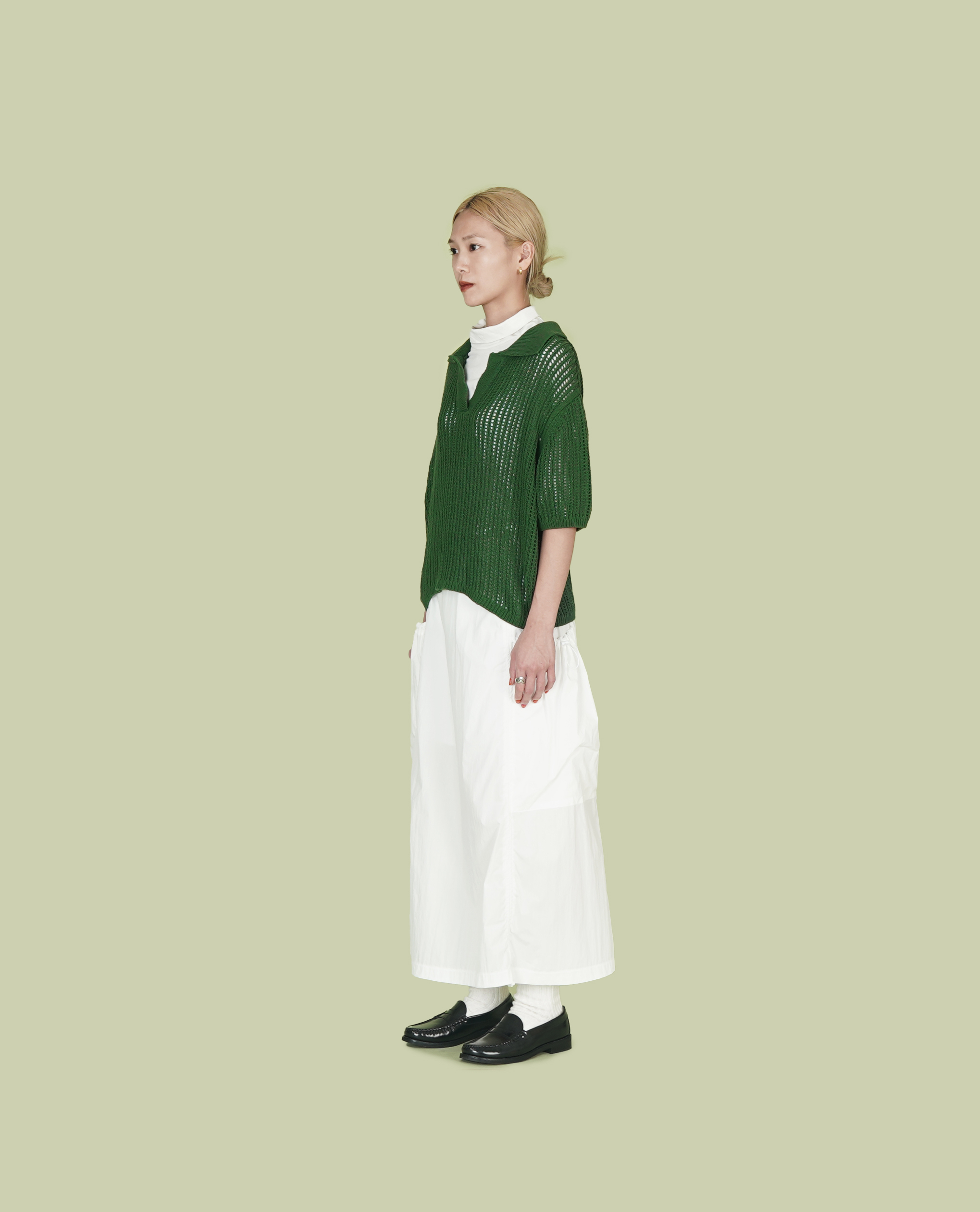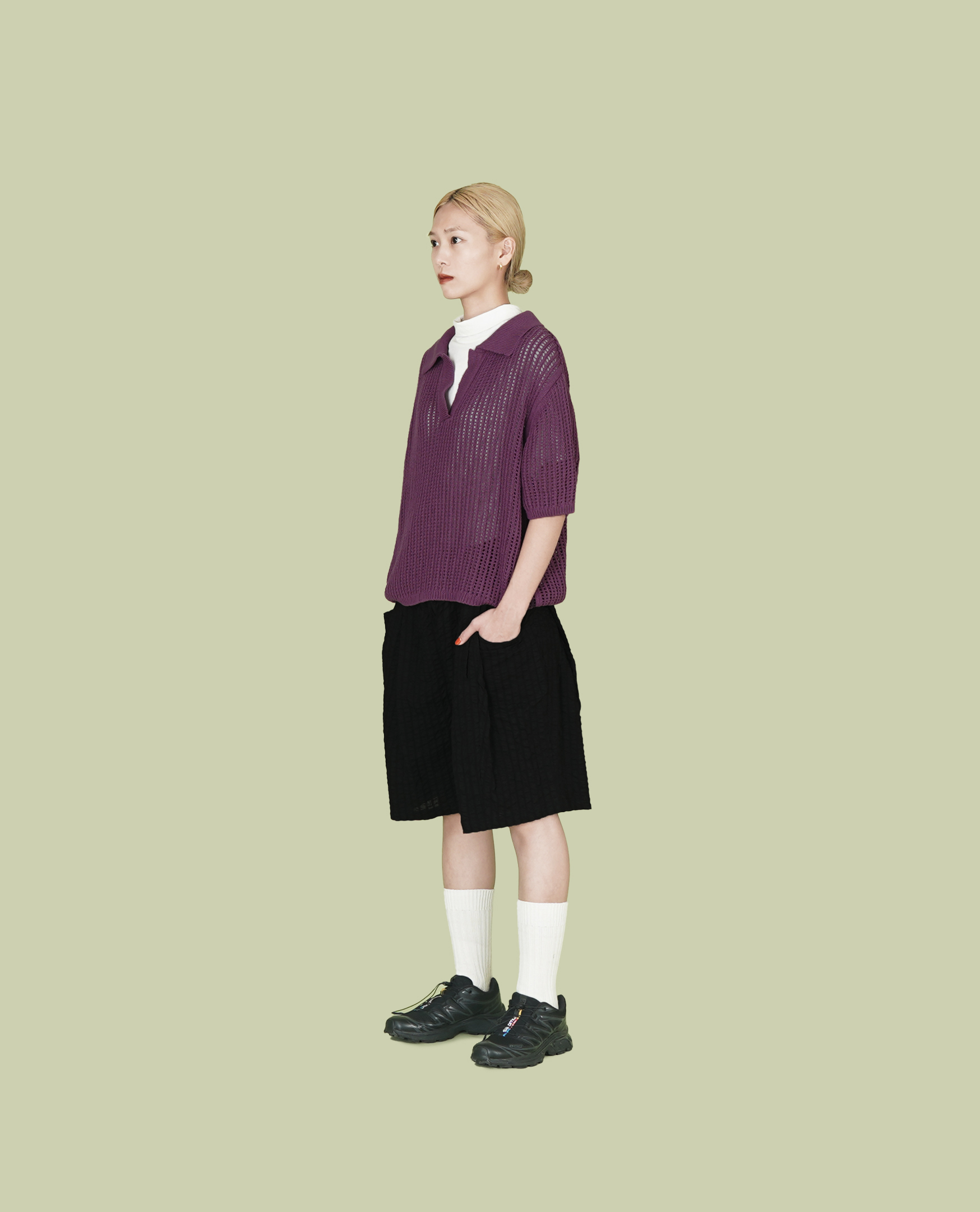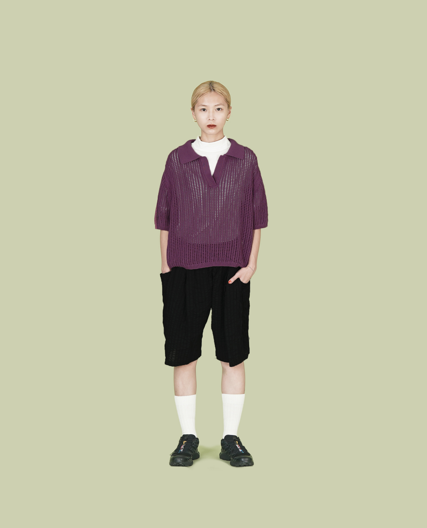 V領半袖洞洞針織上衣