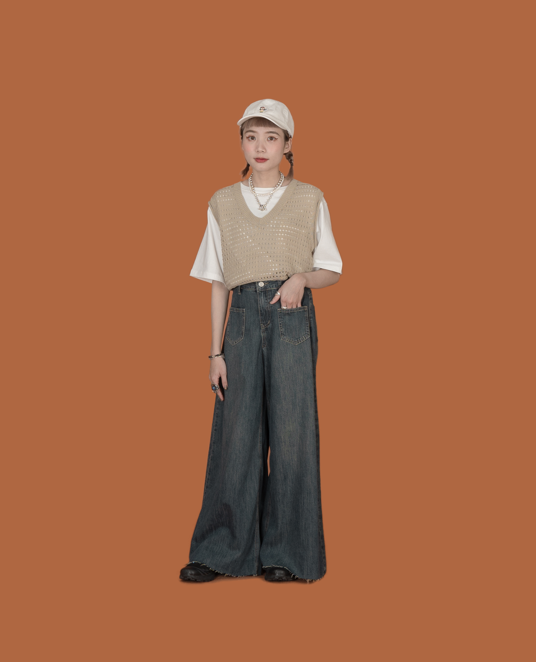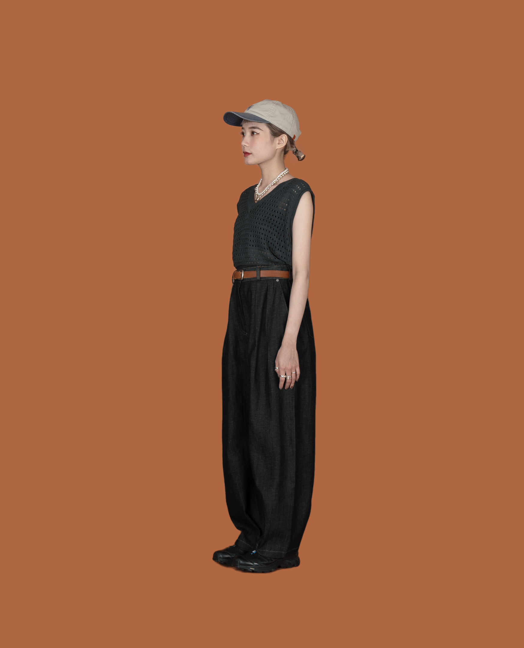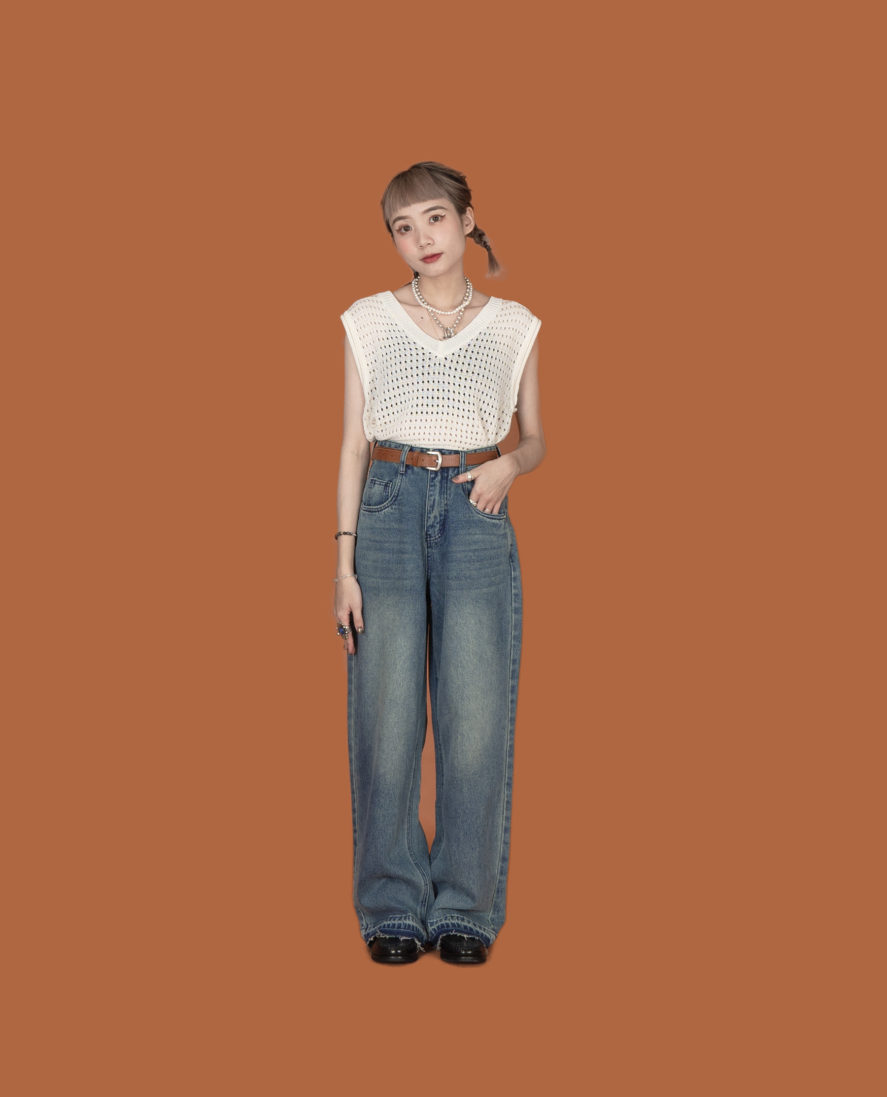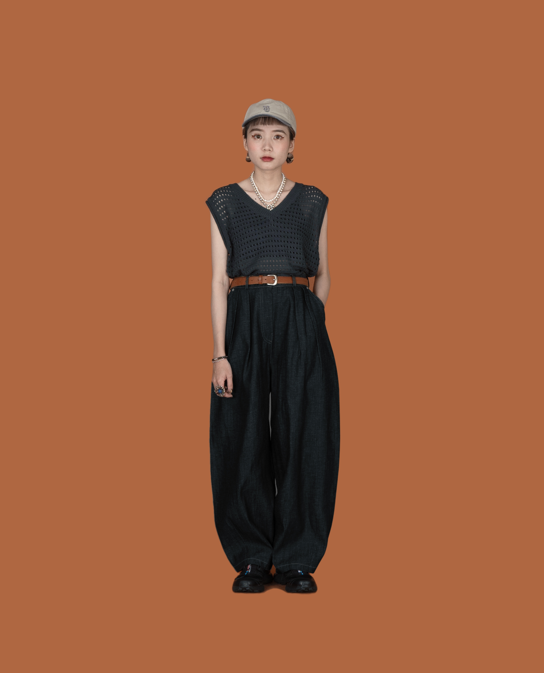 * Model 褲子:前4摺牛仔氣球褲寬A字下不收邊牛仔落地足口刷色牛仔