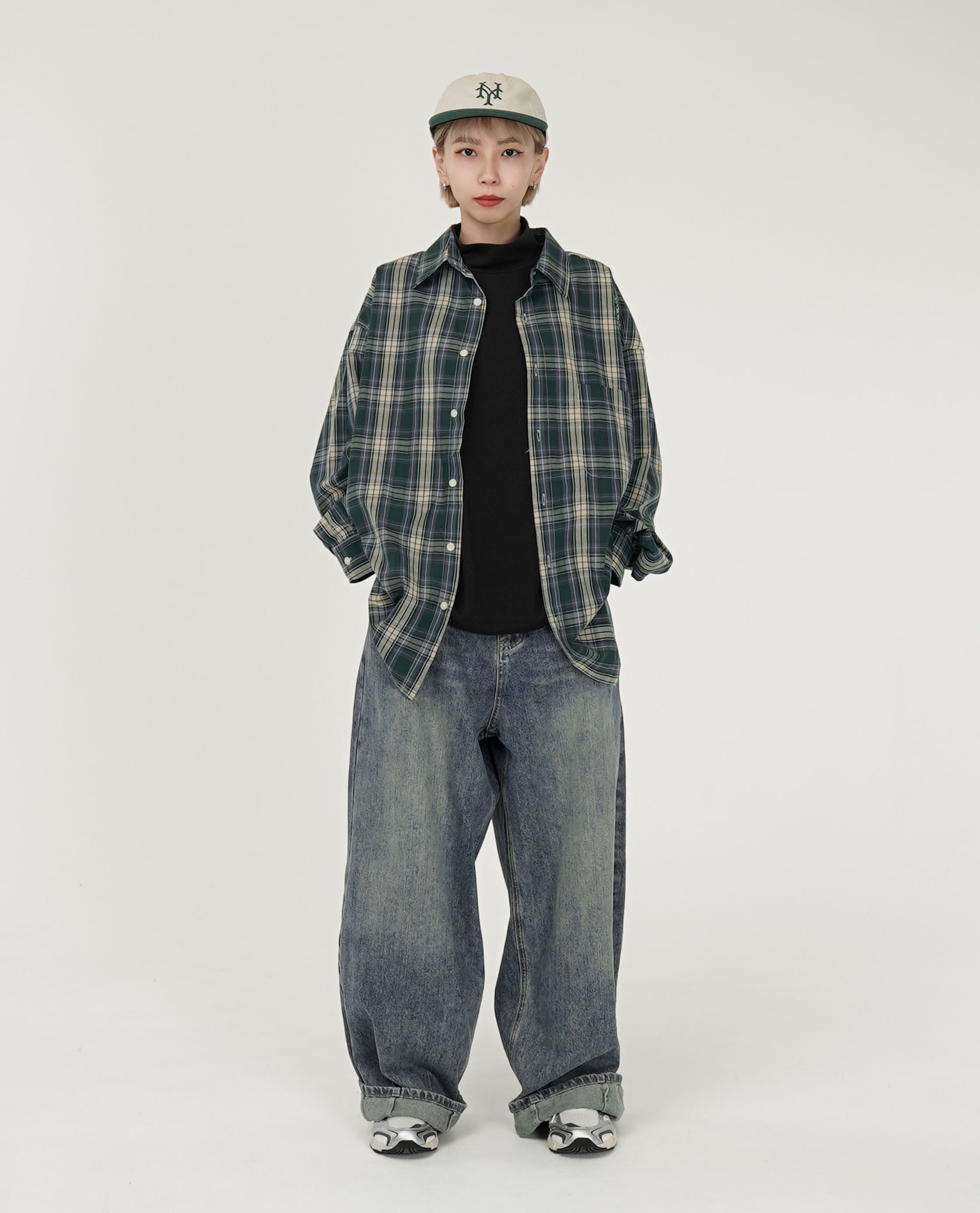 * Model 上衣:拉鍊水洗連帽外套大格紋單邊口袋襯衫