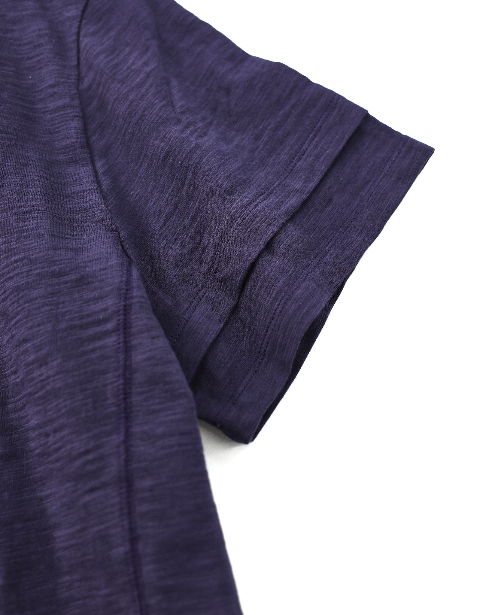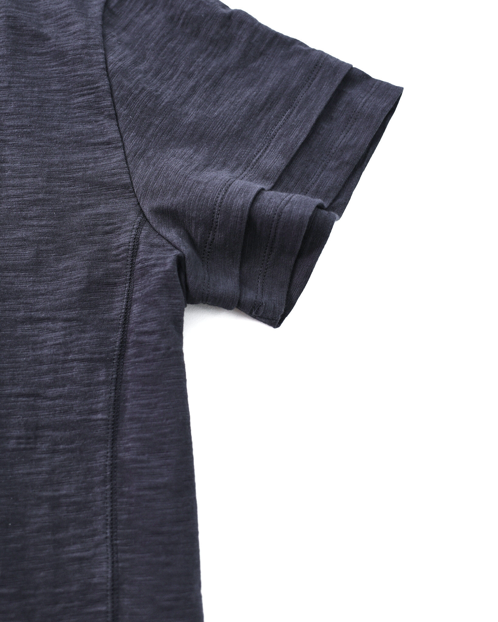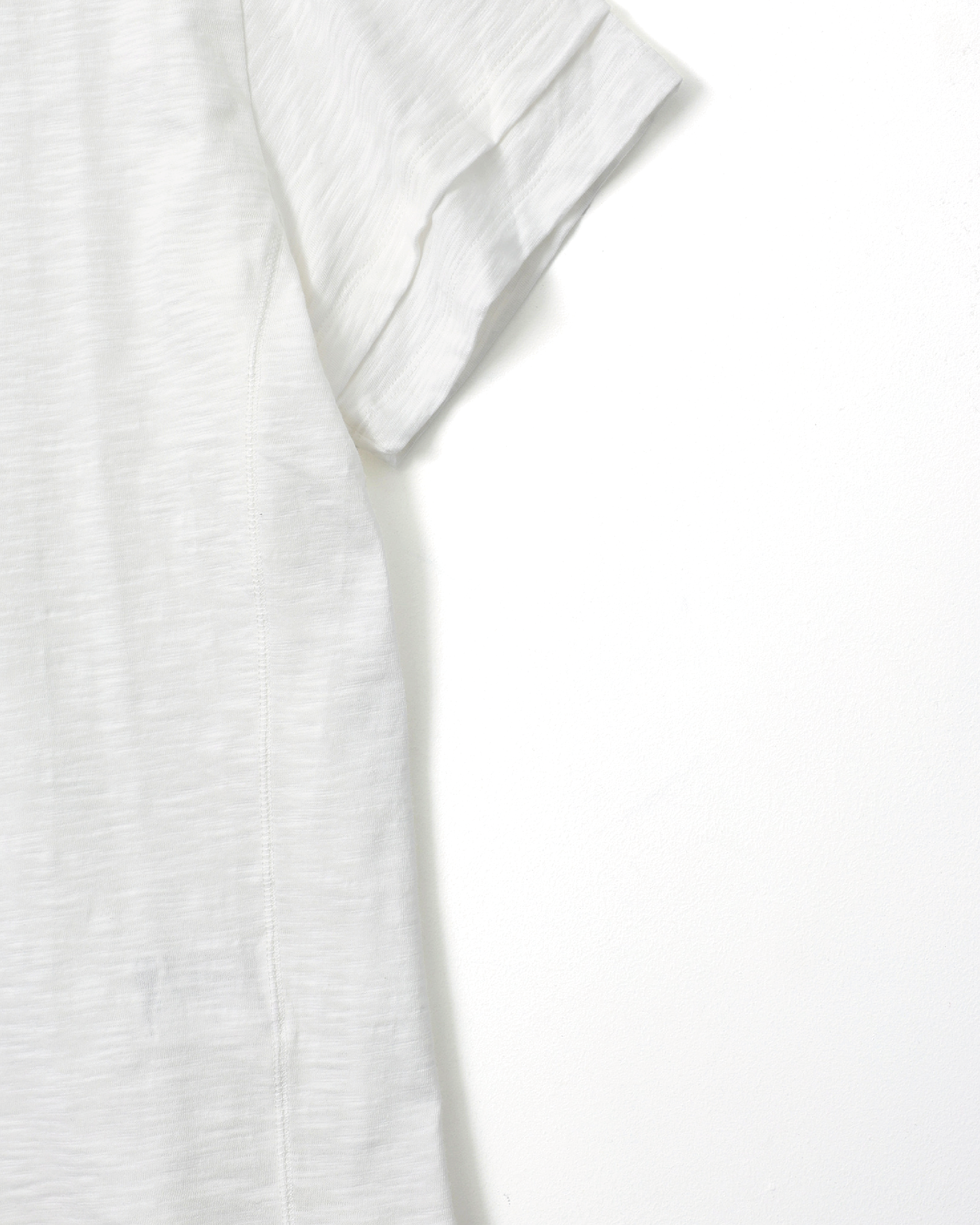 採用竹節(slub)面料,呈現自然紋理感,並於袖口與下擺加入斜向層次設計,提升造型細節。