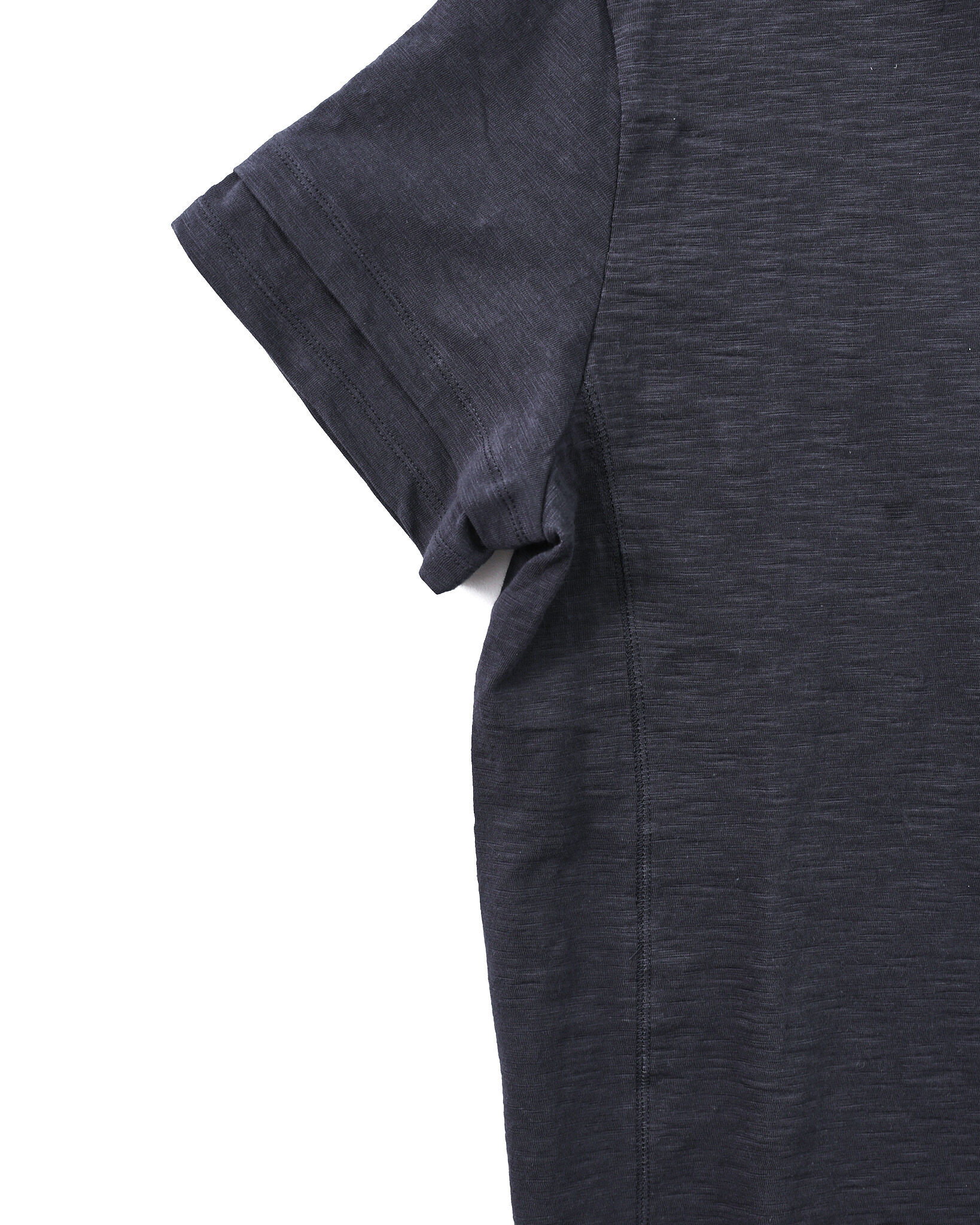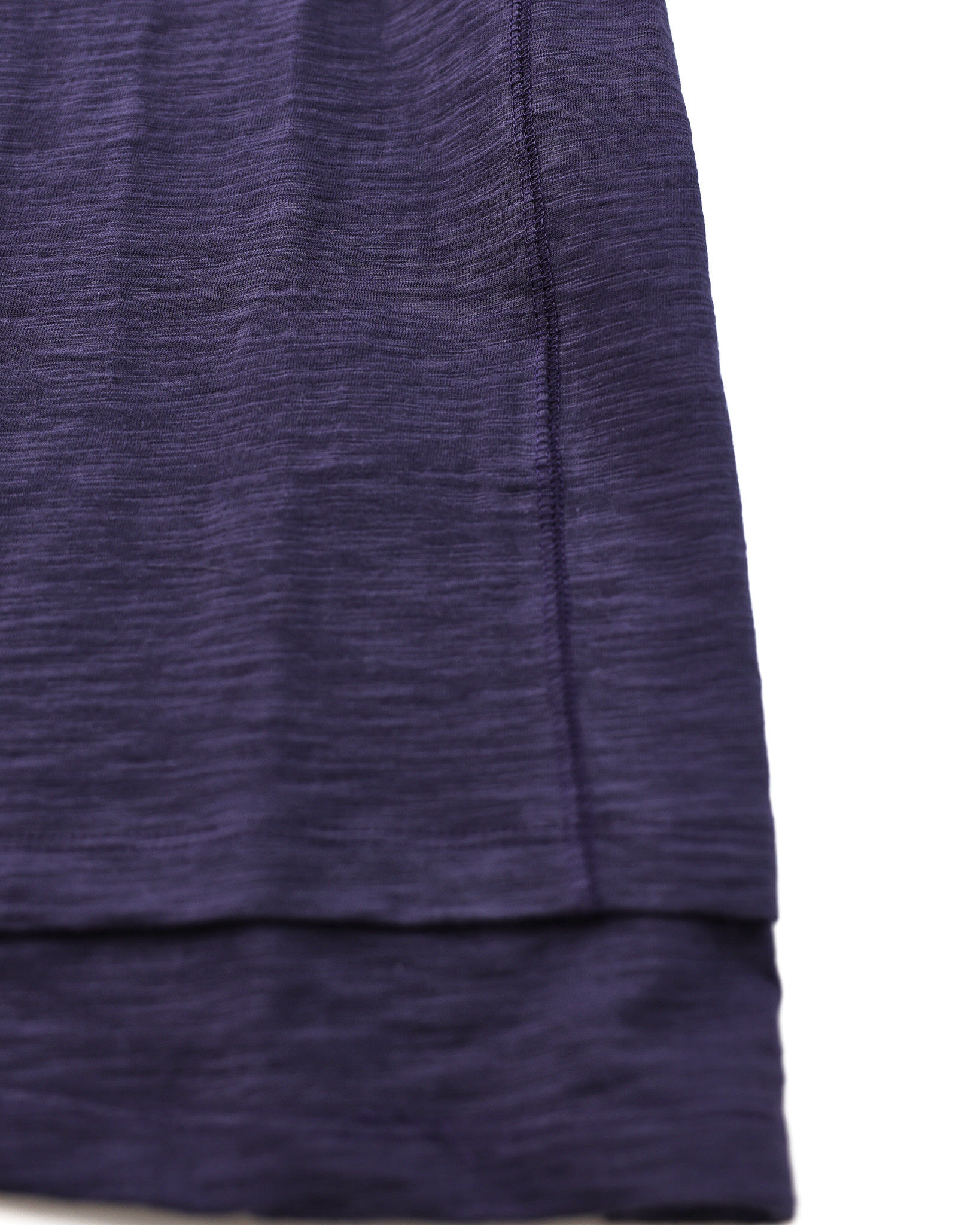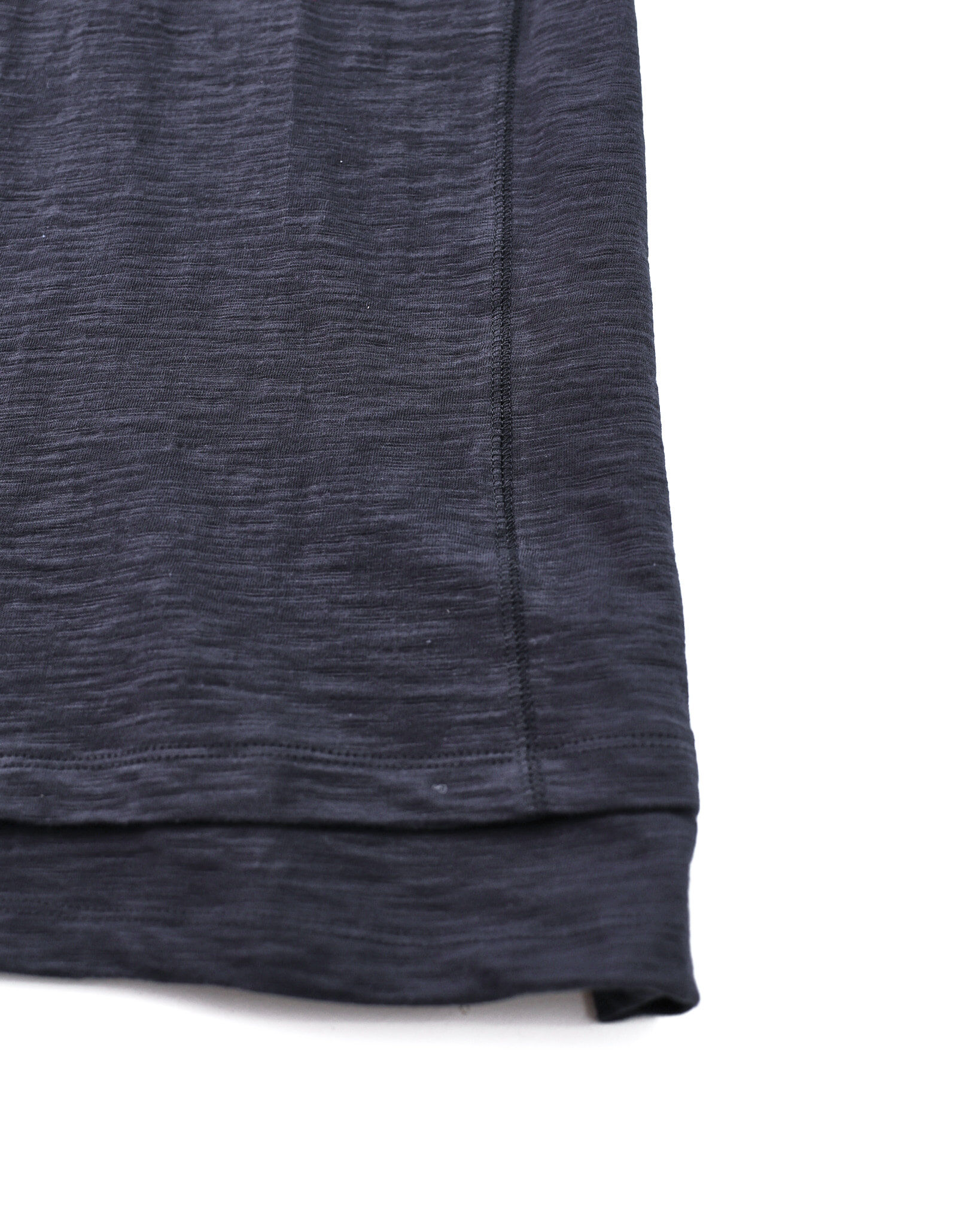 採用竹節(slub)面料,呈現自然紋理感,並於袖口與下擺加入斜向層次設計,提升造型細節。