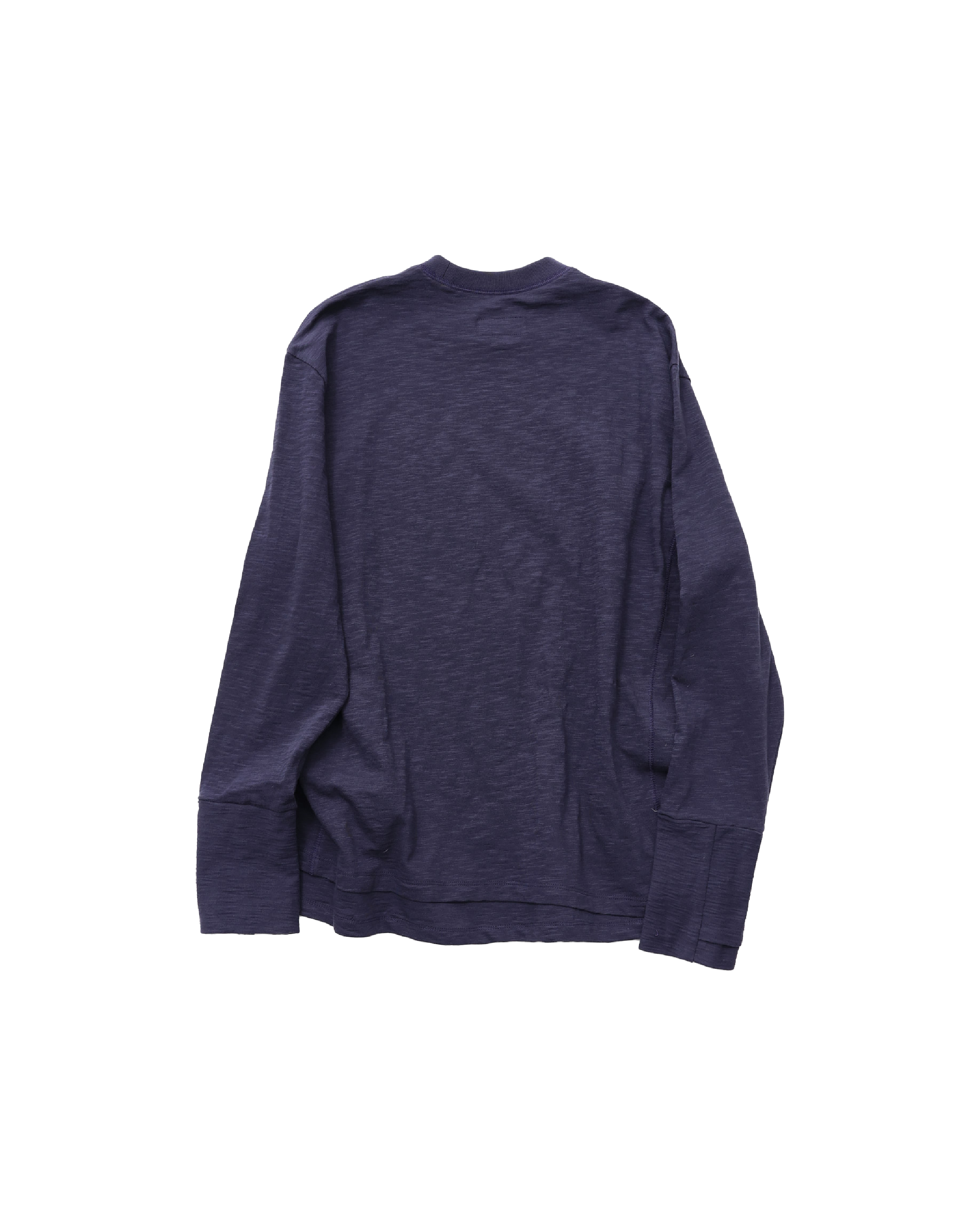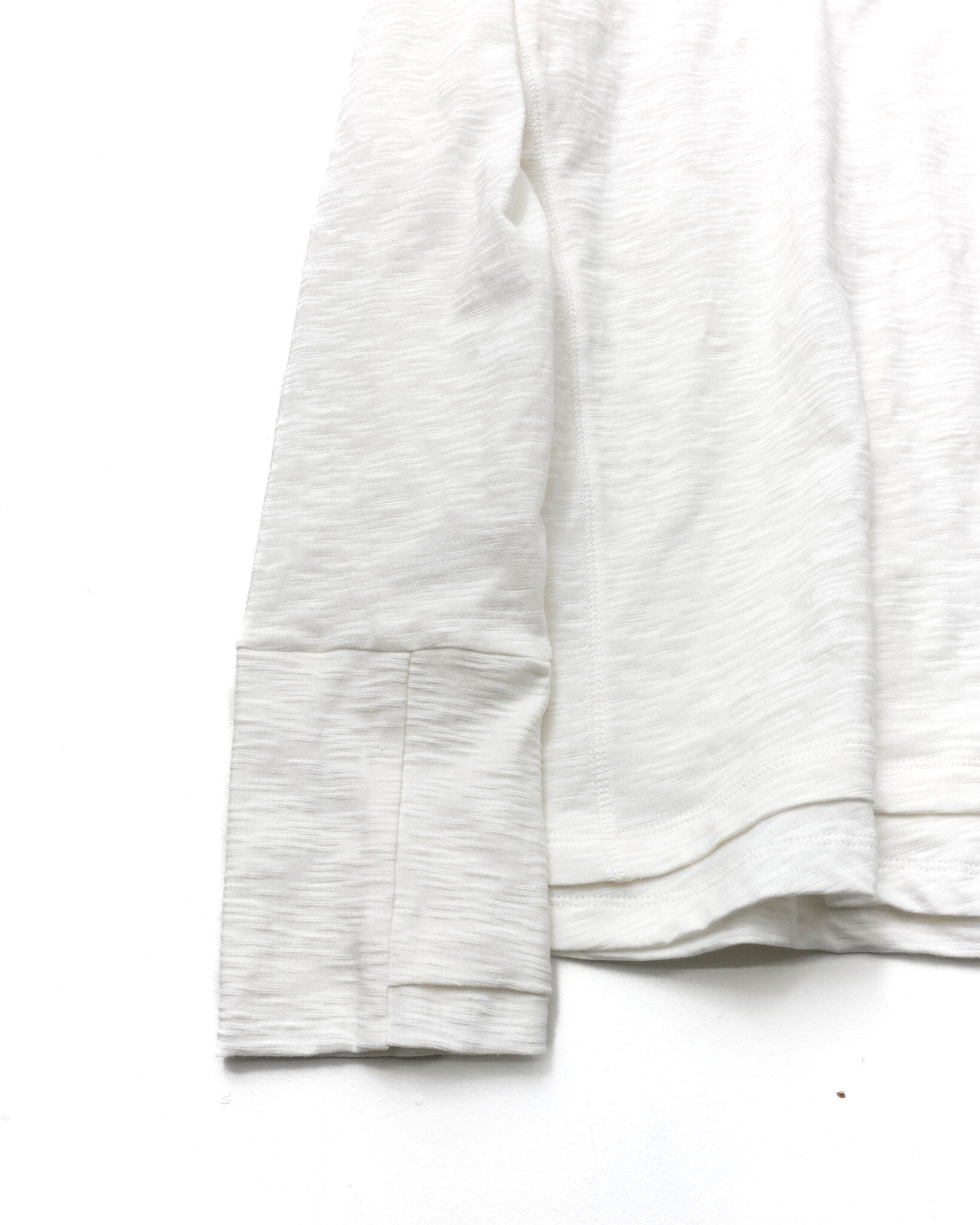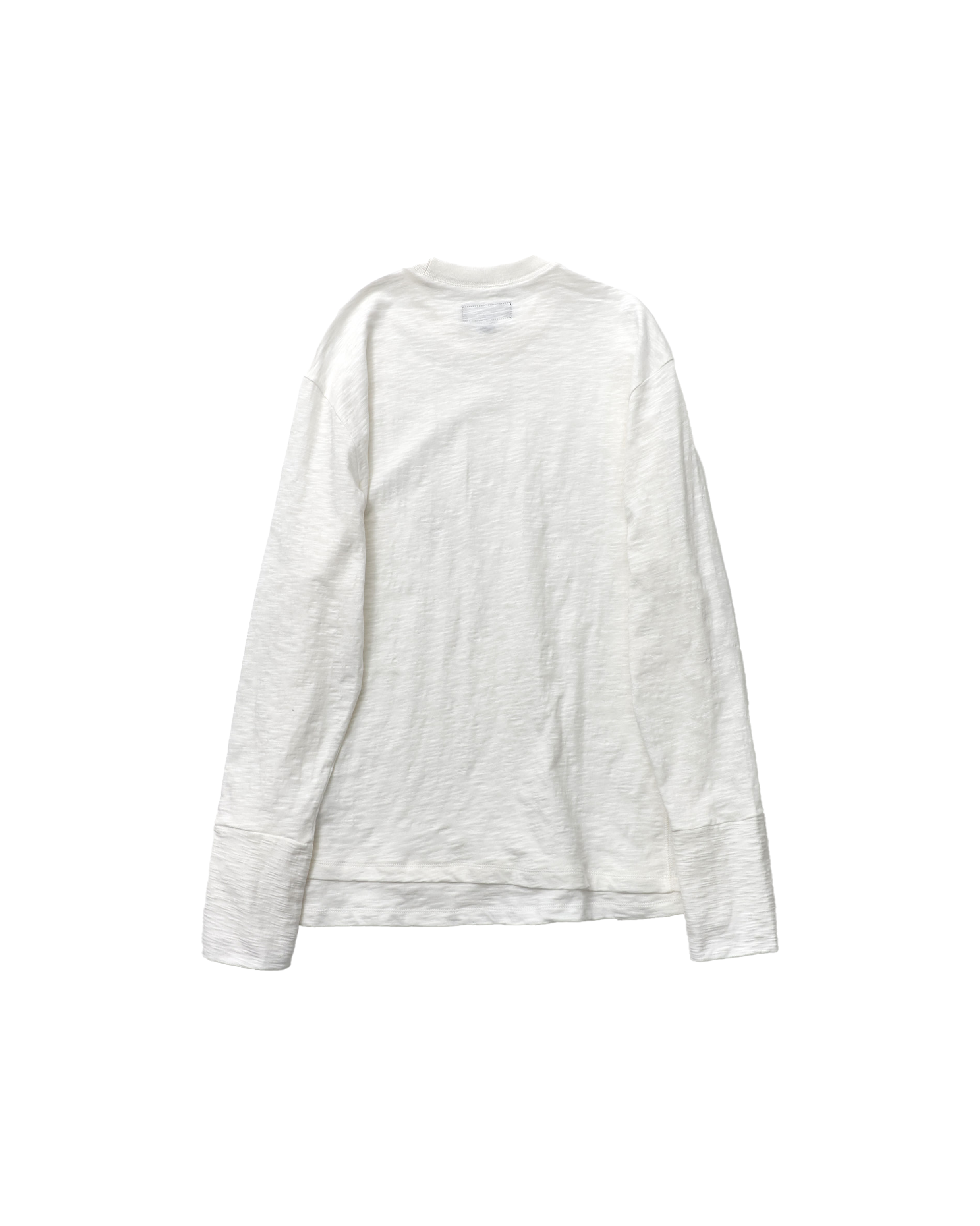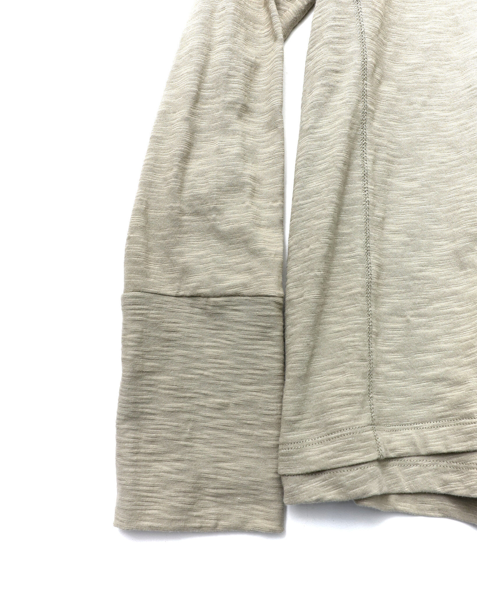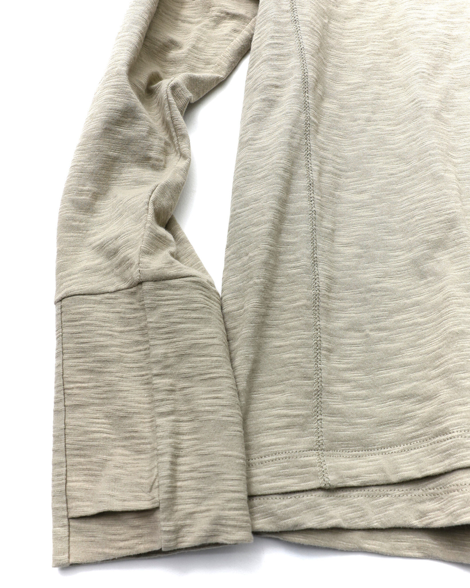 採用竹節(slub)面料,搭配斜向層次設計,並結合袖口拇指孔(finger hole)與前後側邊的 cover stitch 車縫細節,營造出完整的復古氛圍。
