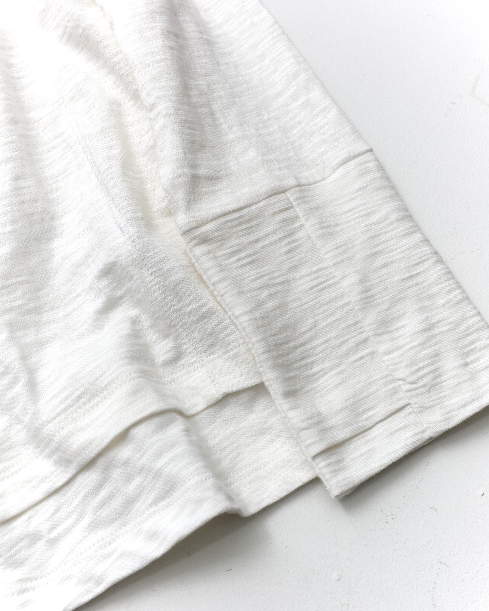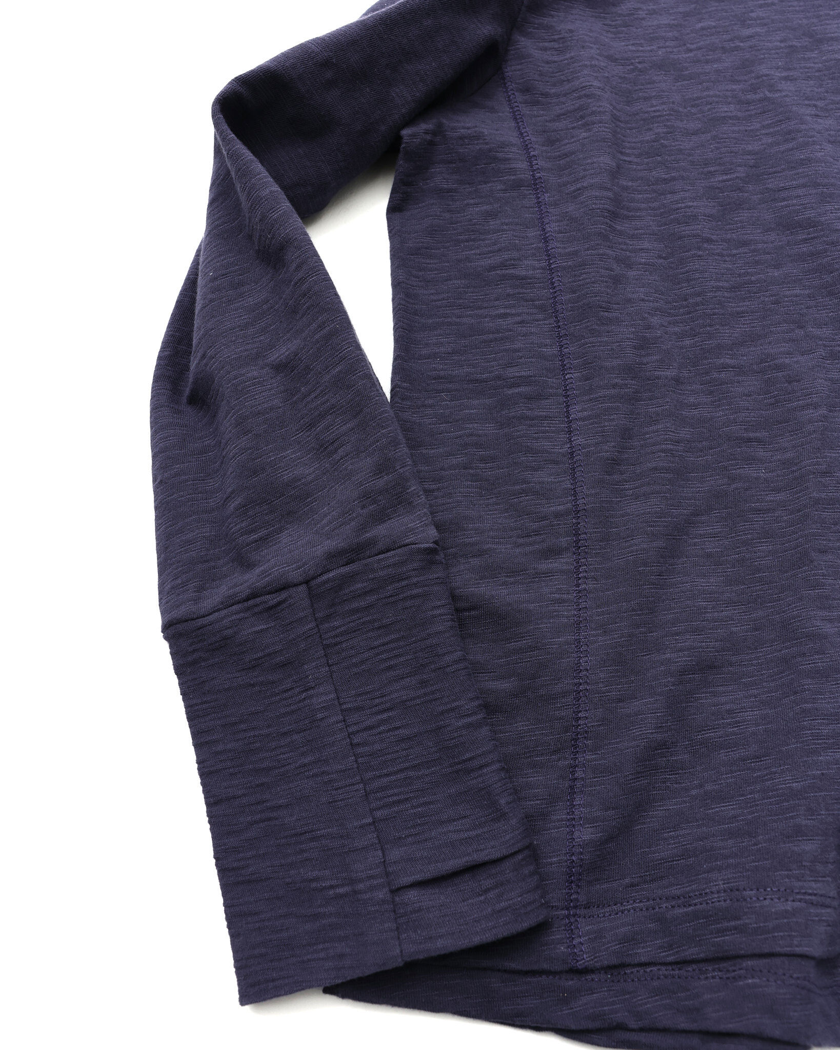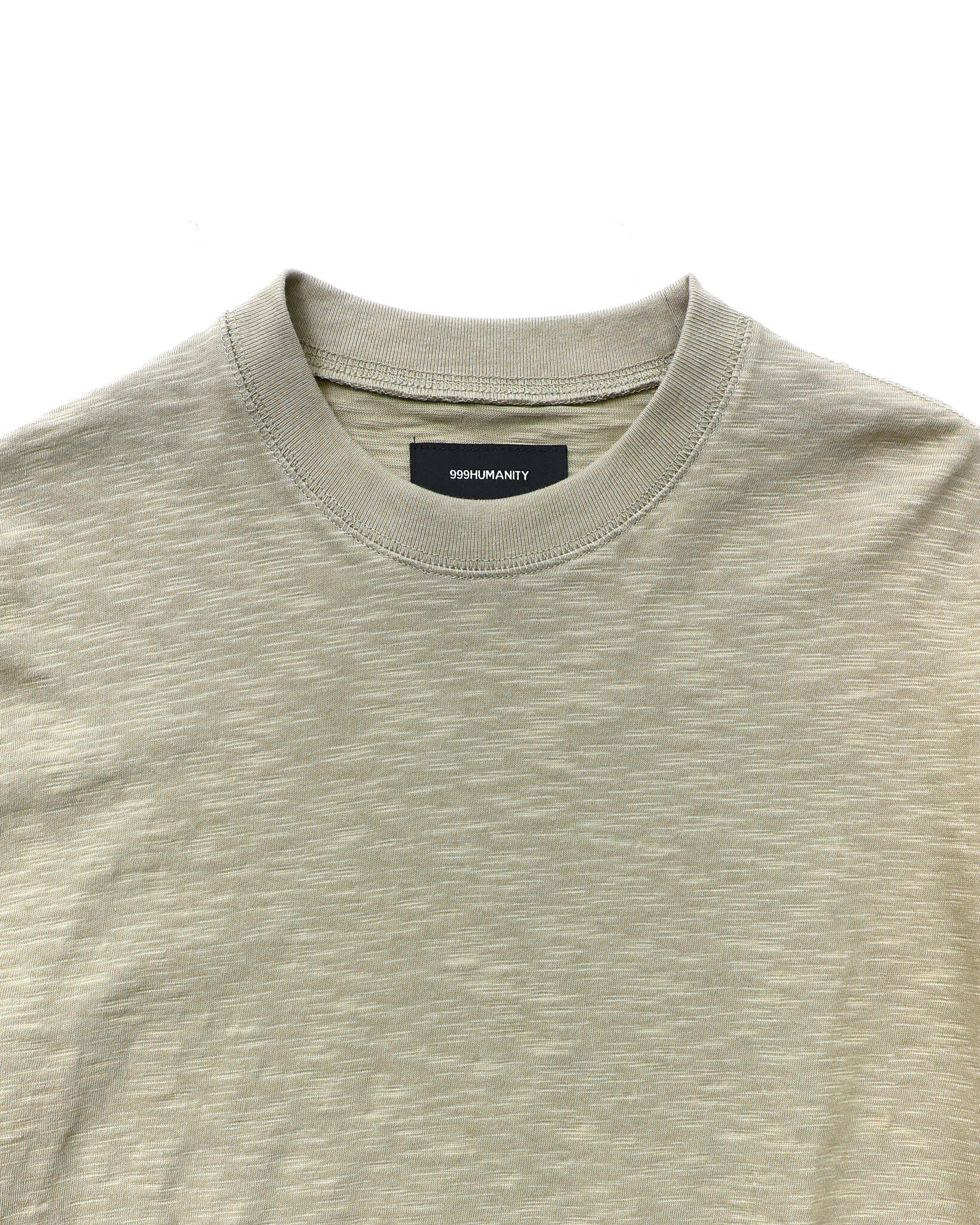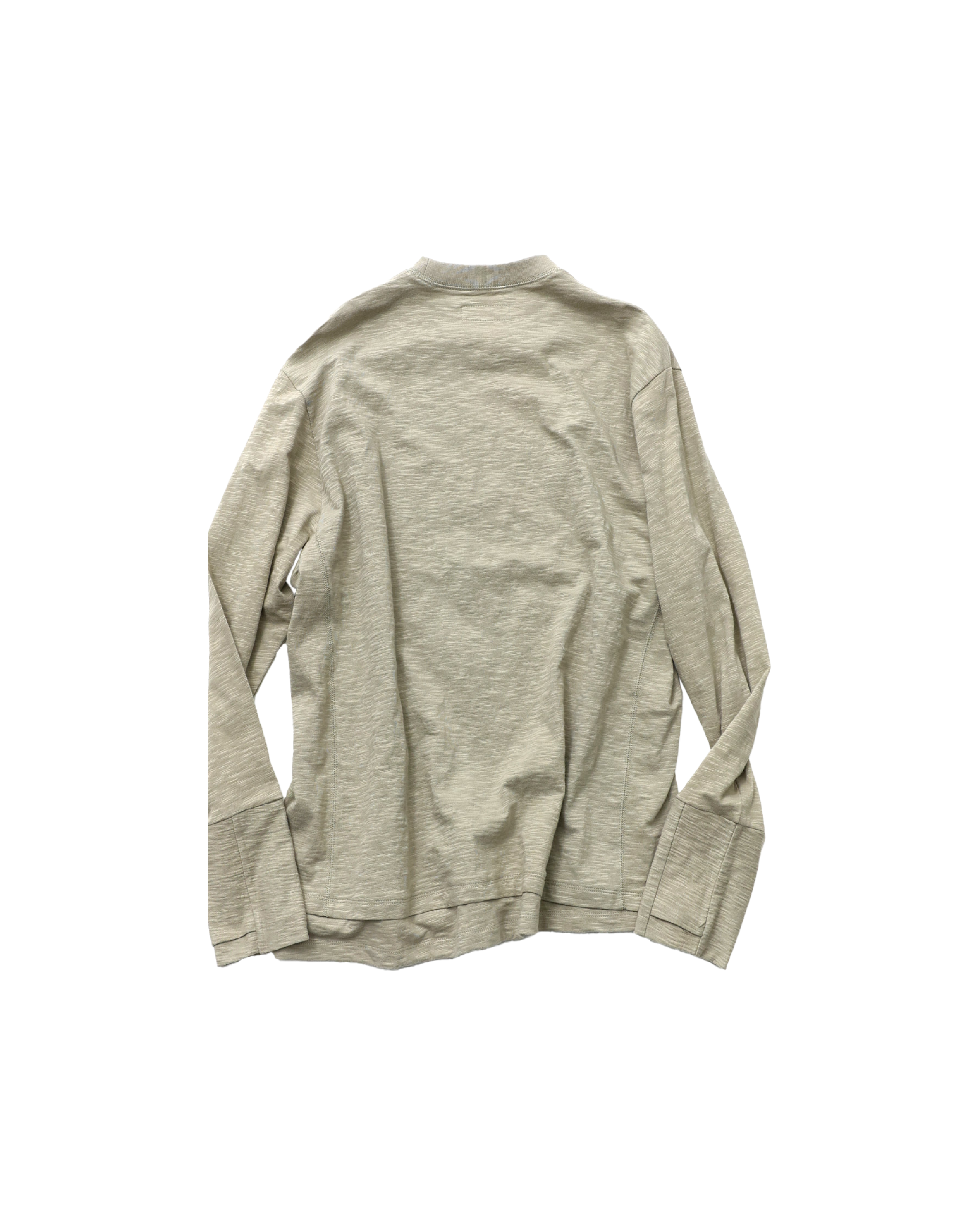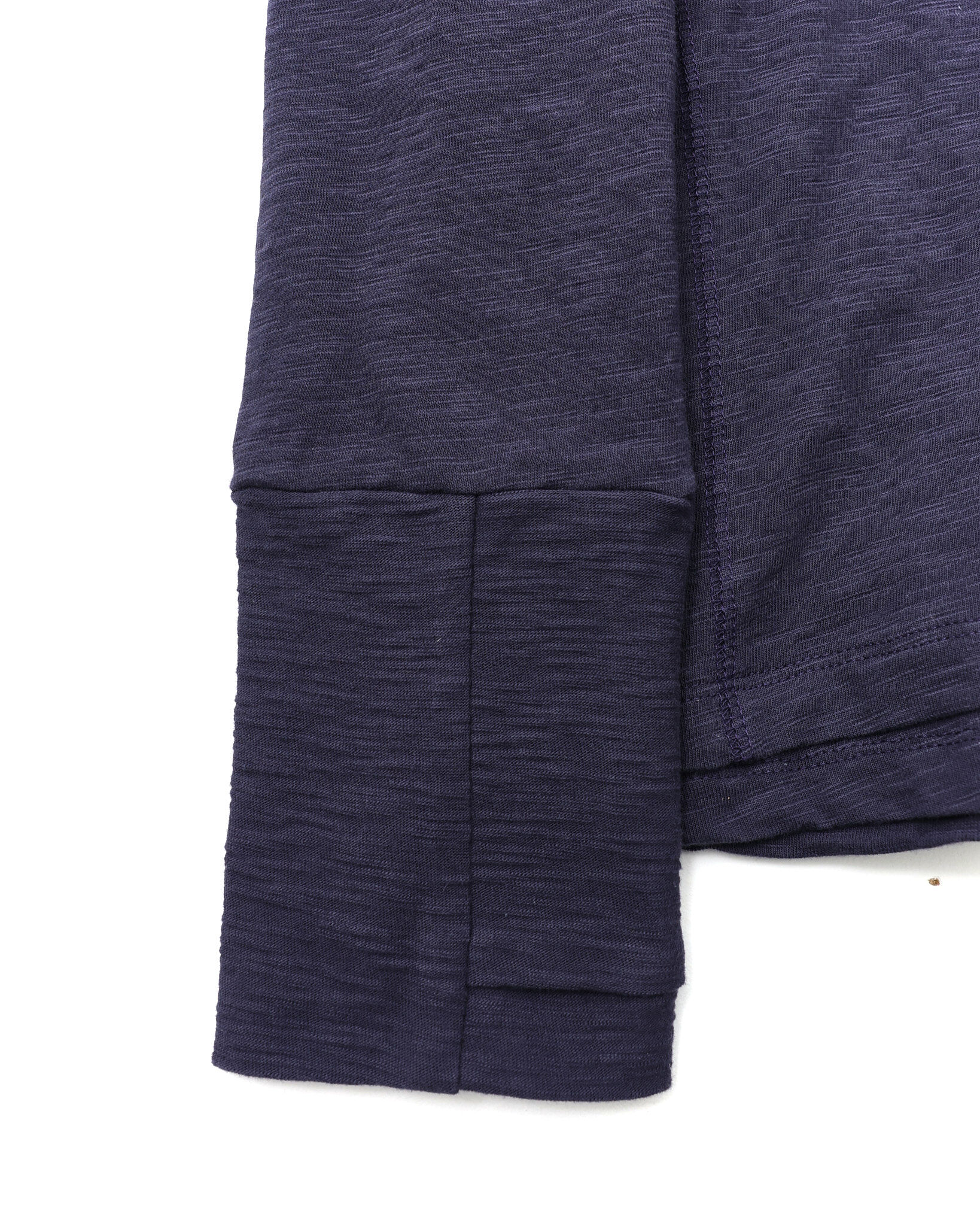 採用竹節(slub)面料,搭配斜向層次設計,並結合袖口拇指孔(finger hole)與前後側邊的 cover stitch 車縫細節,營造出完整的復古氛圍。