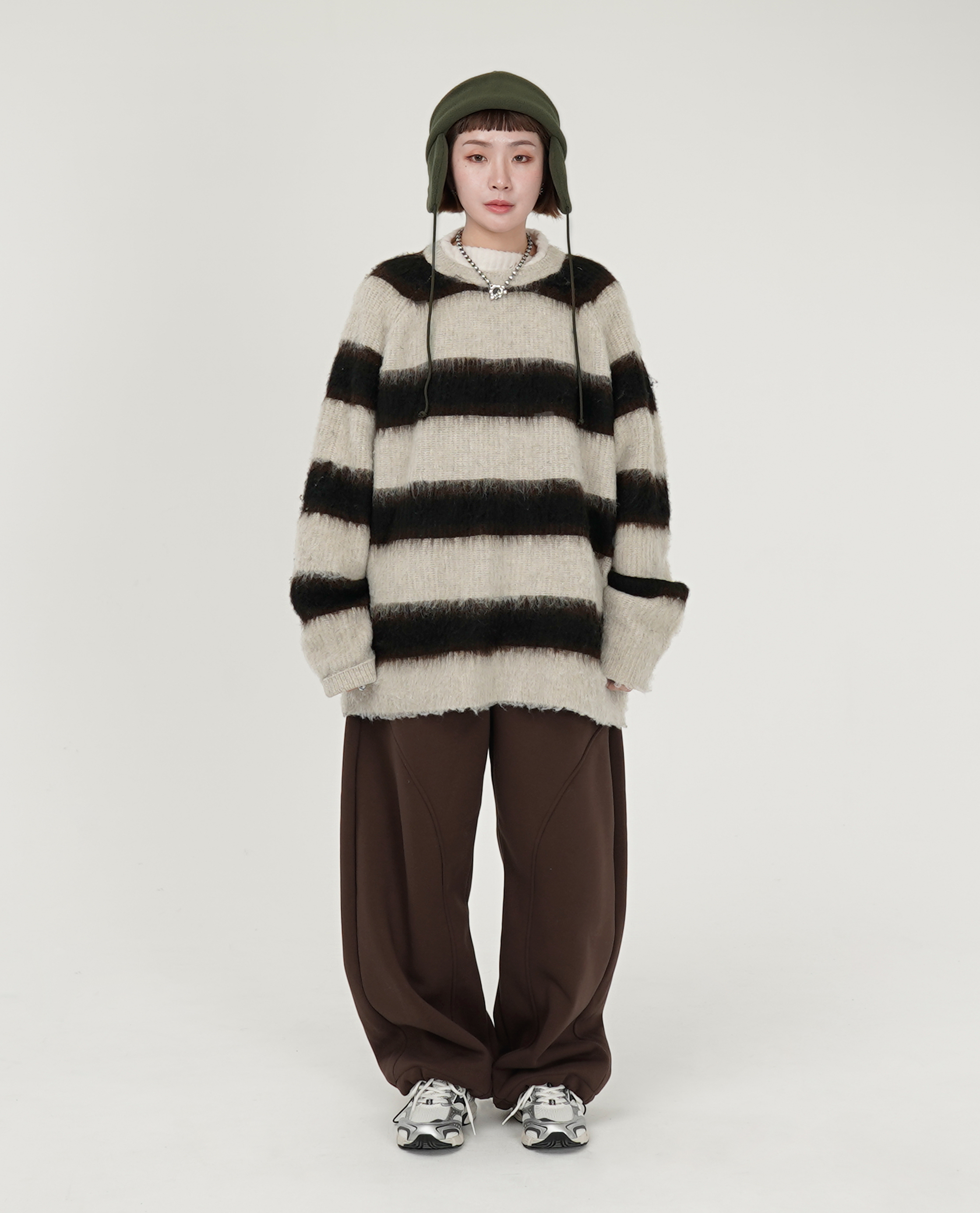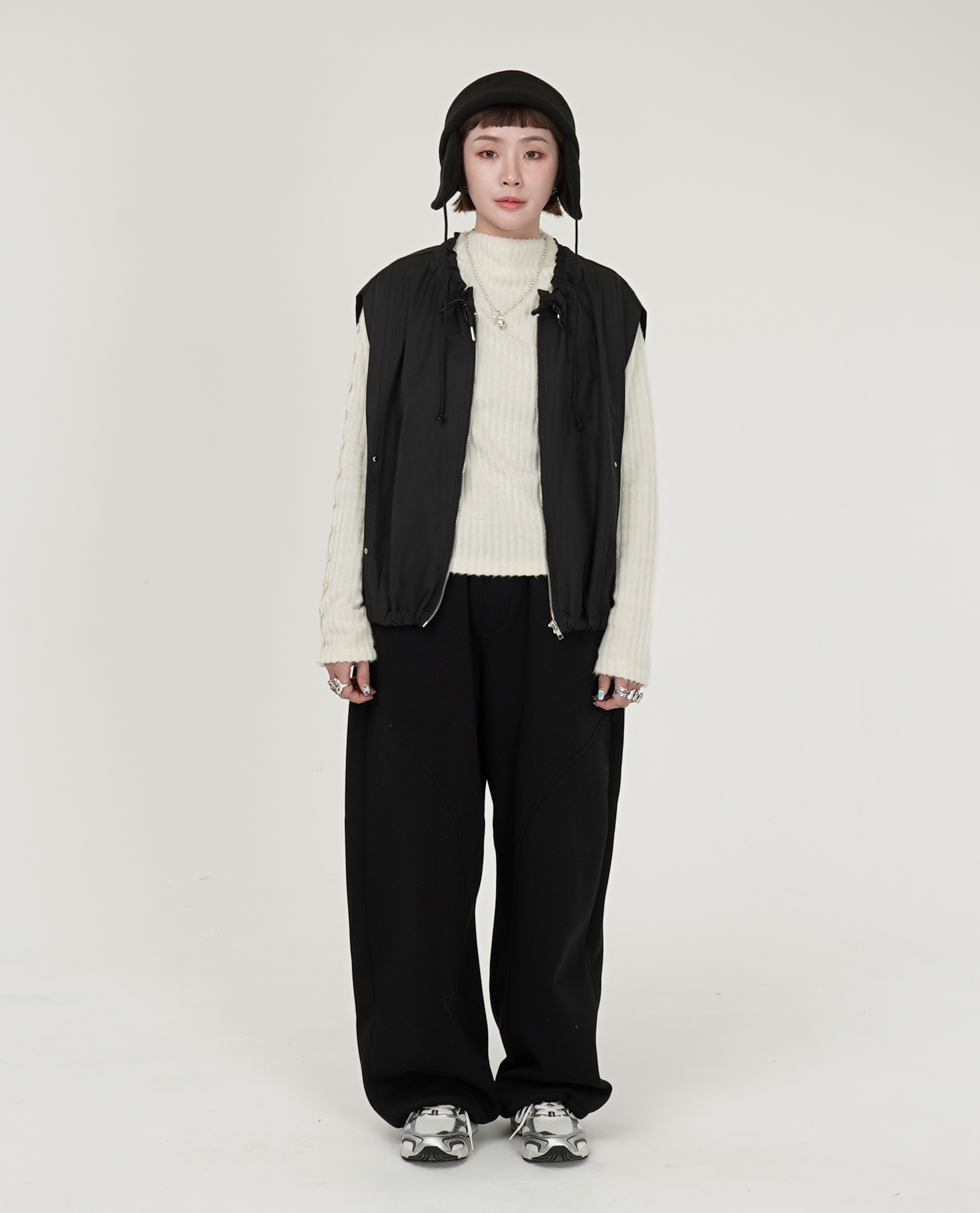 *看 Model 上衣:拉鍊寬短水洗牛仔外套、小領連袖寬條紋軟料毛衣、縮口領寬版背心